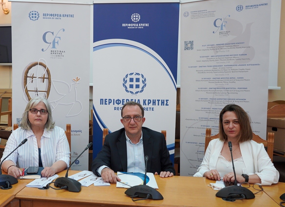 Θα δοθούν, είπε, (3 )συναυλίες από την κρατική ορχήστρα σε Κνωσό και Νέο Αρχαιολογικό Μουσείο Χανίων και ακολουθούν σημαντικά καλλιτεχνικά γεγονότα του Φεστιβάλ Κρήτης σε ολόκληρο το νησί μας, με την συμμετοχή: Μαρίας Φαραντούρη, Παντελή Θαλασσινού, Κώστα Μακεδόνα, Ιωάννας Φόρτη, την ορχήστρα νέων Κρήτης, το διεθνώς γνωστό σύνολο ‘ Young wind Masters” από το Μουσικό Πανεπιστήμιο της Βιέννης, το διεθνώς αναγνωρισμένο piano duo Antithesis Δ. Καρύδης & Π. Μόσχος, το Λυρικό θέατρο Κρήτης, κα.