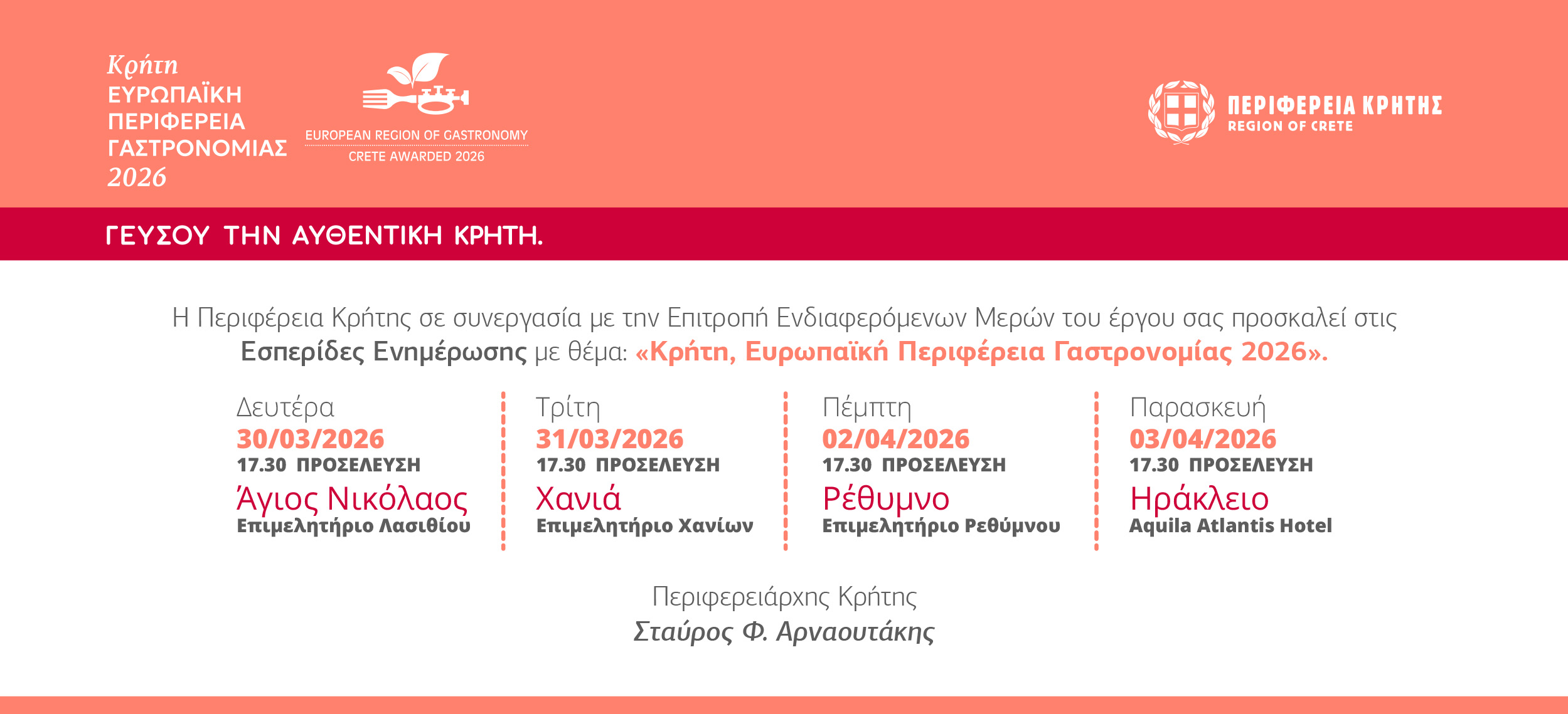 Η Περιφέρεια Κρήτης, σε συνεργασία με την Επιτροπή Ενδιαφερόμενων Μερών του έργου, καλεί φορείς του κλάδου της Φιλοξενίας και της Εστίασης, επαγγελματίες και πολίτες να συμμετάσχουν στις εκδηλώσεις με θέμα: «Κρήτη Ευρωπαϊκή Περιφέρεια Γαστρονομίας 2026».