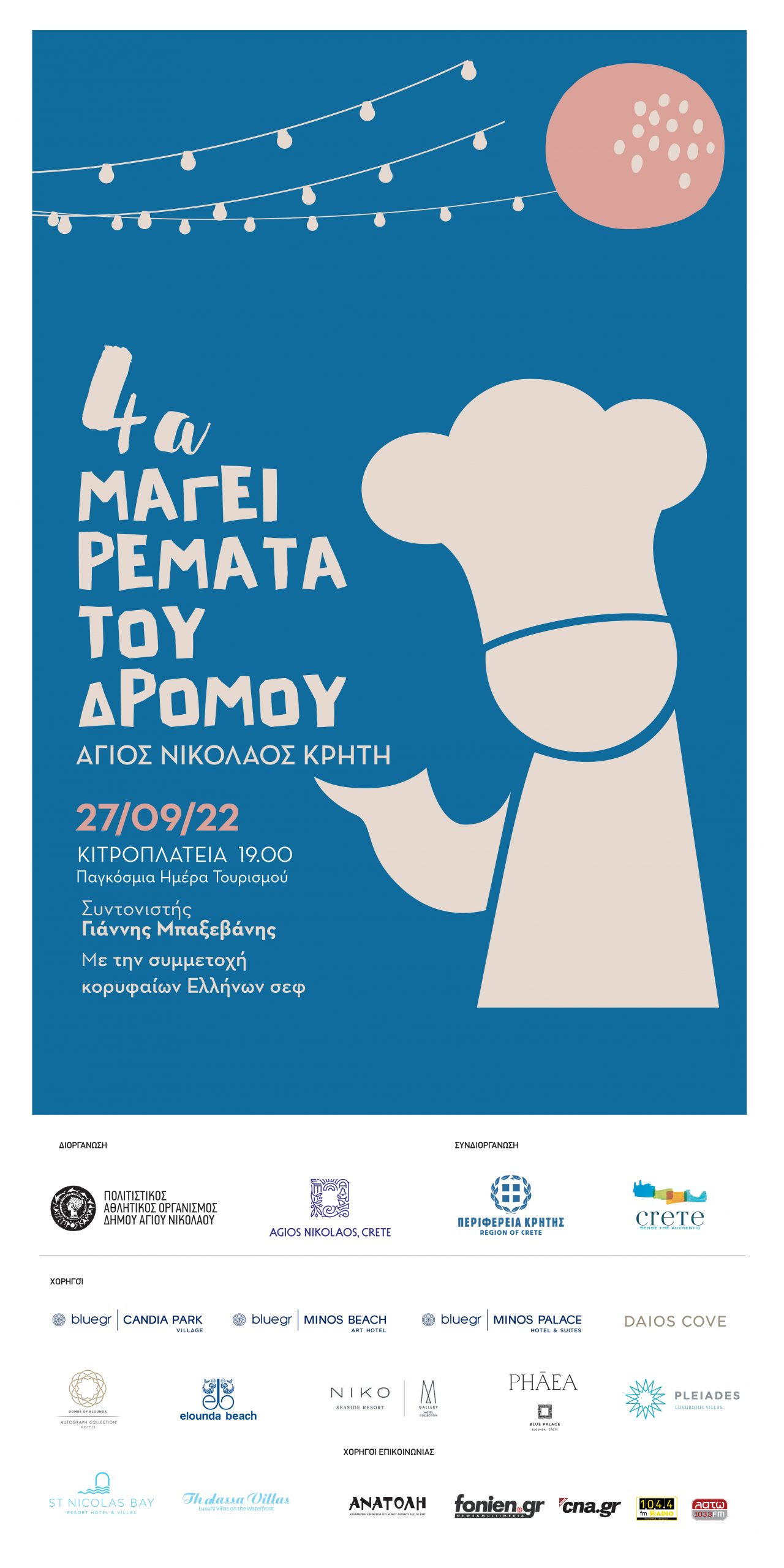 Με την ενεργή παρουσία και στήριξη της Λέσχης Αρχιμαγείρων Κρήτης και την φιλοξενία διακεκριμένων μαγείρων της σύγχρονης ελληνικής κουζίνας, ο Πολιτιστικός Αθλητικός Οργανισμός του Δήμου Αγίου Νικολάου (ΠΑΟΔΑΝ) διοργανώνει για τέταρτη φορά με την στήριξη της Περιφέρειας Κρήτης μια ξεχωριστή εμπειρία γευσιγνωστικών απολαύσεων για κάθε επισκέπτη και κάτοικο του Αγίου Νικολάου και της Κρήτης, προκειμένου να τιμήσει τη γιορτή τουρισμού.