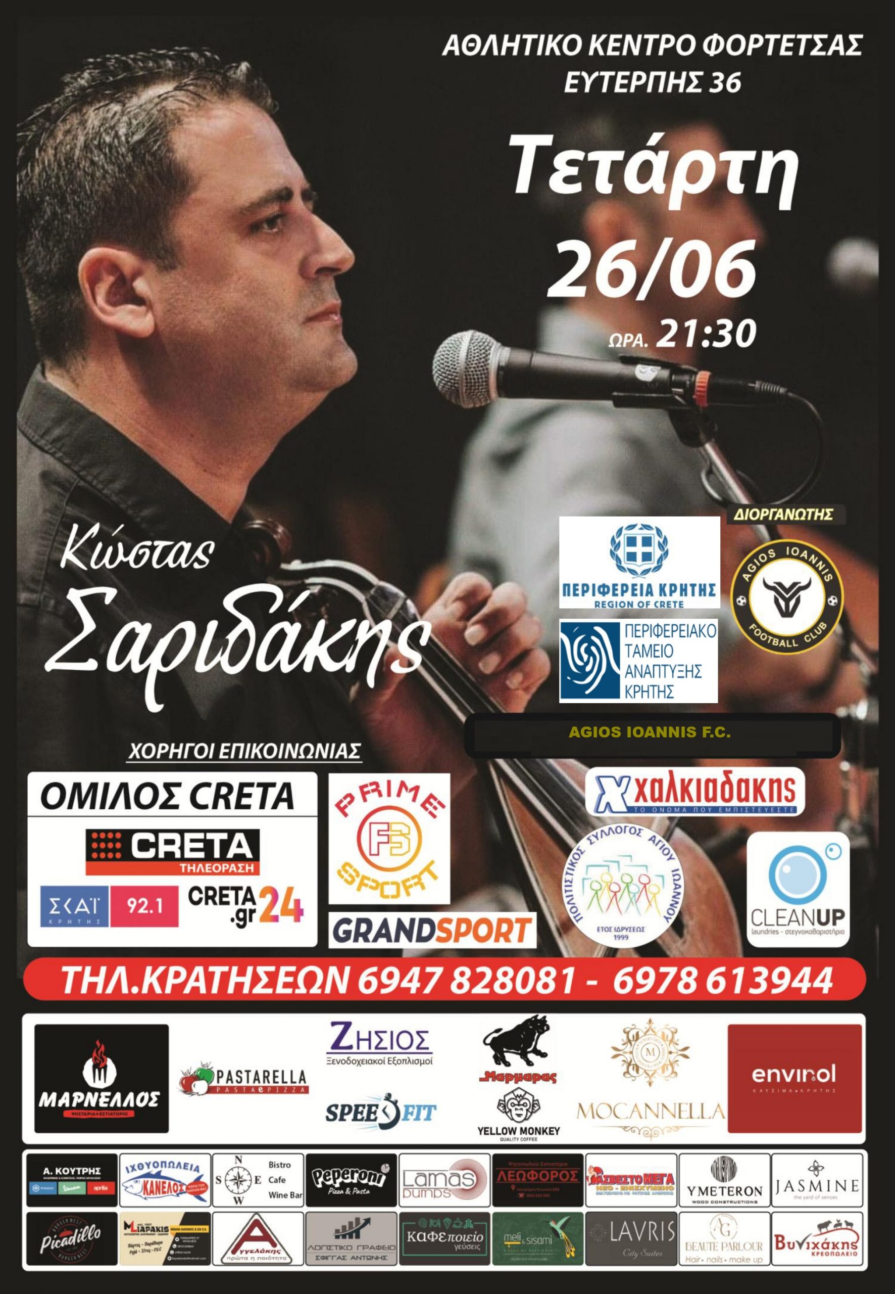 Στα πλαίσια των καλοκαιρινών εκδηλώσεων ο εξωραϊστικός-αναπτυξιακός πολιτιστικός σύλλογος Αγ. Ιωάννη με την υποστήριξη της Περιφέρειας Κρήτης οργανώνει κρητική βραδιά με το συγκρότημα του Κώστα Σαριδάκη την Τέταρτη 26 Ιουνίου στο Αθλητικό κέντρο Φορτέτσας (Ευτέρπης 36) με ώρα έναρξης στις 21:30.