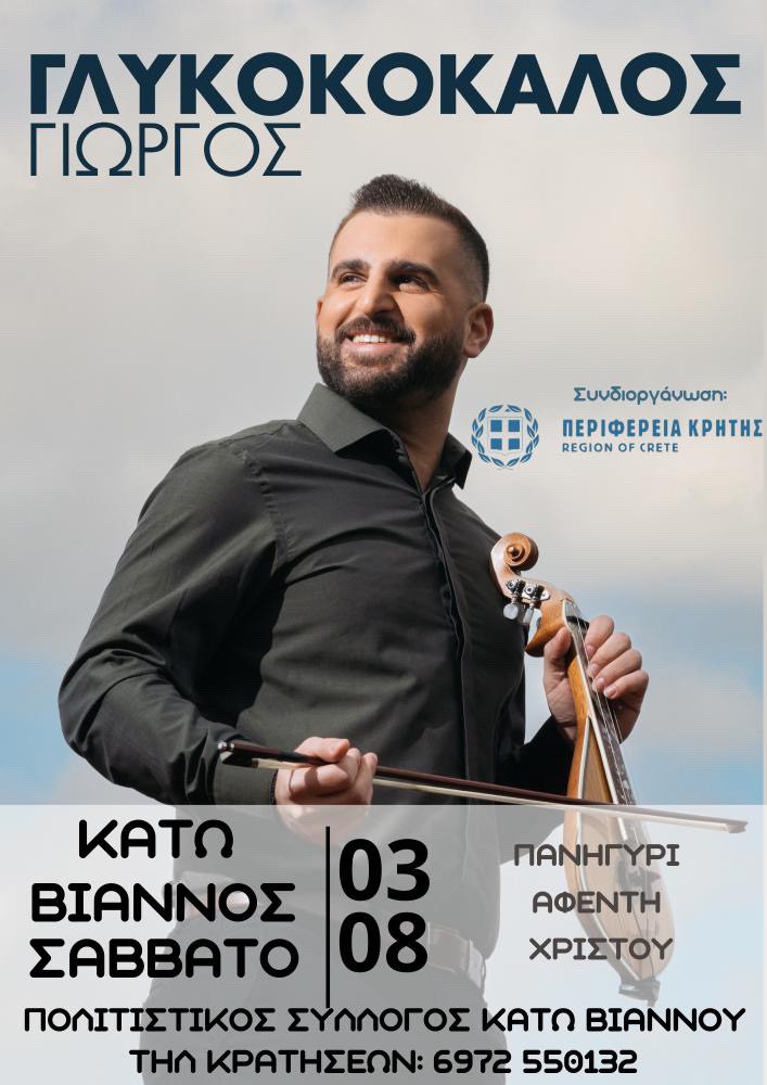 Ο πολιτιστικός σύλλογος Κάτω Βιάννου διοργανώνει κρητική βραδιά για τη γιορτή του Αφέντη Χριστού, με τη στήριξη της Περιφέρειας Κρήτης.  Η εκδήλωση θα γίνει το Σάββατο 3 Αυγούστου 2024 θα συμμετέχει το συγκρότημα του Γιώργου Γλυκοκόκαλου και ώρα έναρξης στις 9 το βράδυ.