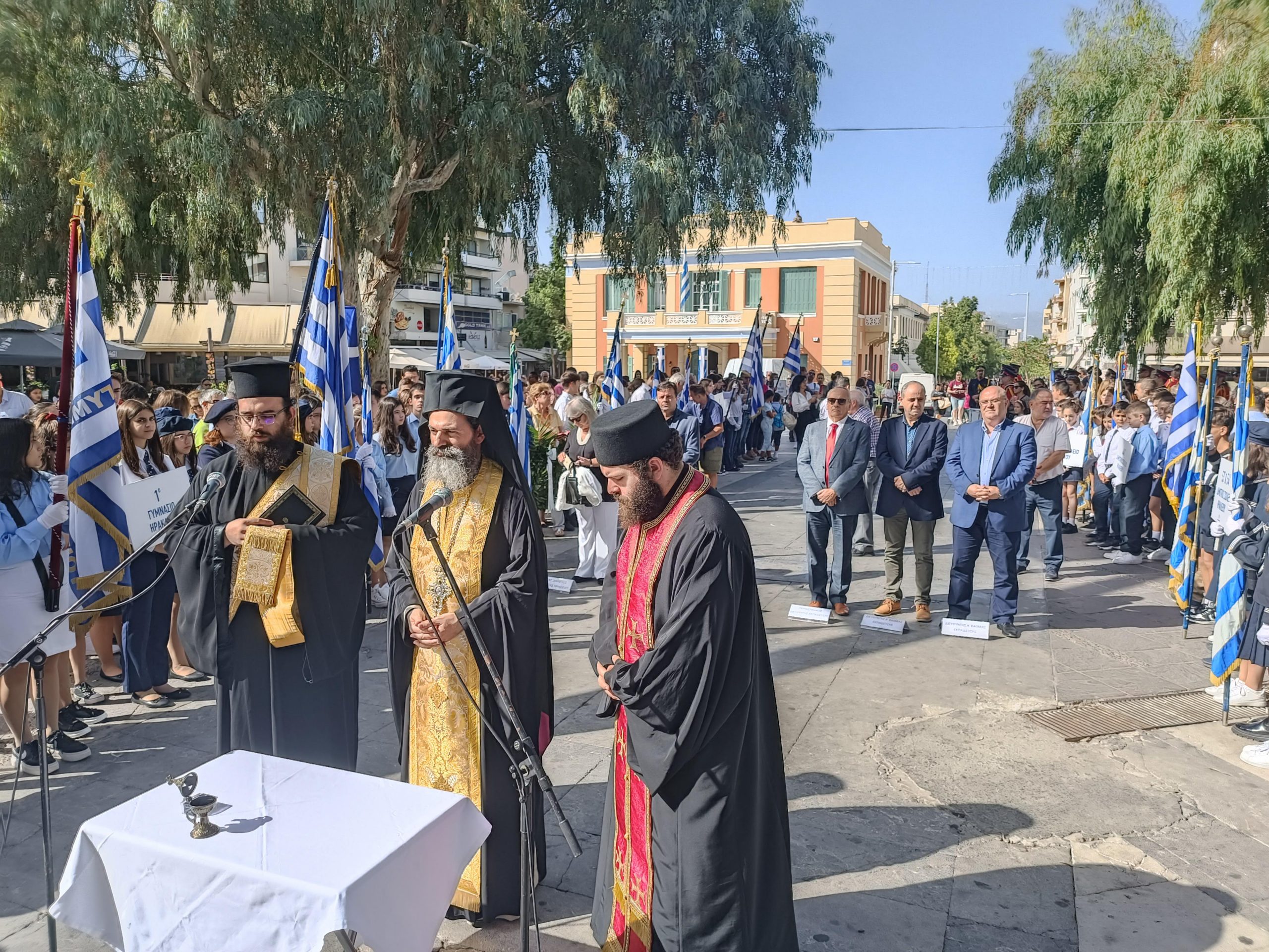 Την επιμνημόσυνη δέηση τέλεσε ο Πρωτοσύγκελος της Ιεράς Αρχιεπισκοπής Κρήτης Βαρθολομαίος Βογιατζόγλου, ενώ στο μνημείο του Άγνωστου Στρατιώτη στεφάνι κατέθεσαν οι: Αντιπεριφερειάρχης Ηρακλείου Νίκος Συριγωνάκης, Αντιδήμαρχος Παιδείας Δήμου Ηρακλείου Στέλλα Αρχοντάκη, Περιφερειακός Διευθυντής Εκπαίδευσης Κρήτης Μανόλης Καρτσωνάκης, Διευθυντής Α/θμιας Εκπαίδευσης Μανόλης Μπελαδάκης, Διευθυντής Β/θμιας Εκπαίδευσης Αντώνης Φουντουλάκης, μαθητές Α/θμιας και Β/θμιας Εκπαίδευσης, εκπρόσωποι σωμάτων Ελληνικού Οδηγισμού και Προσκόπων.