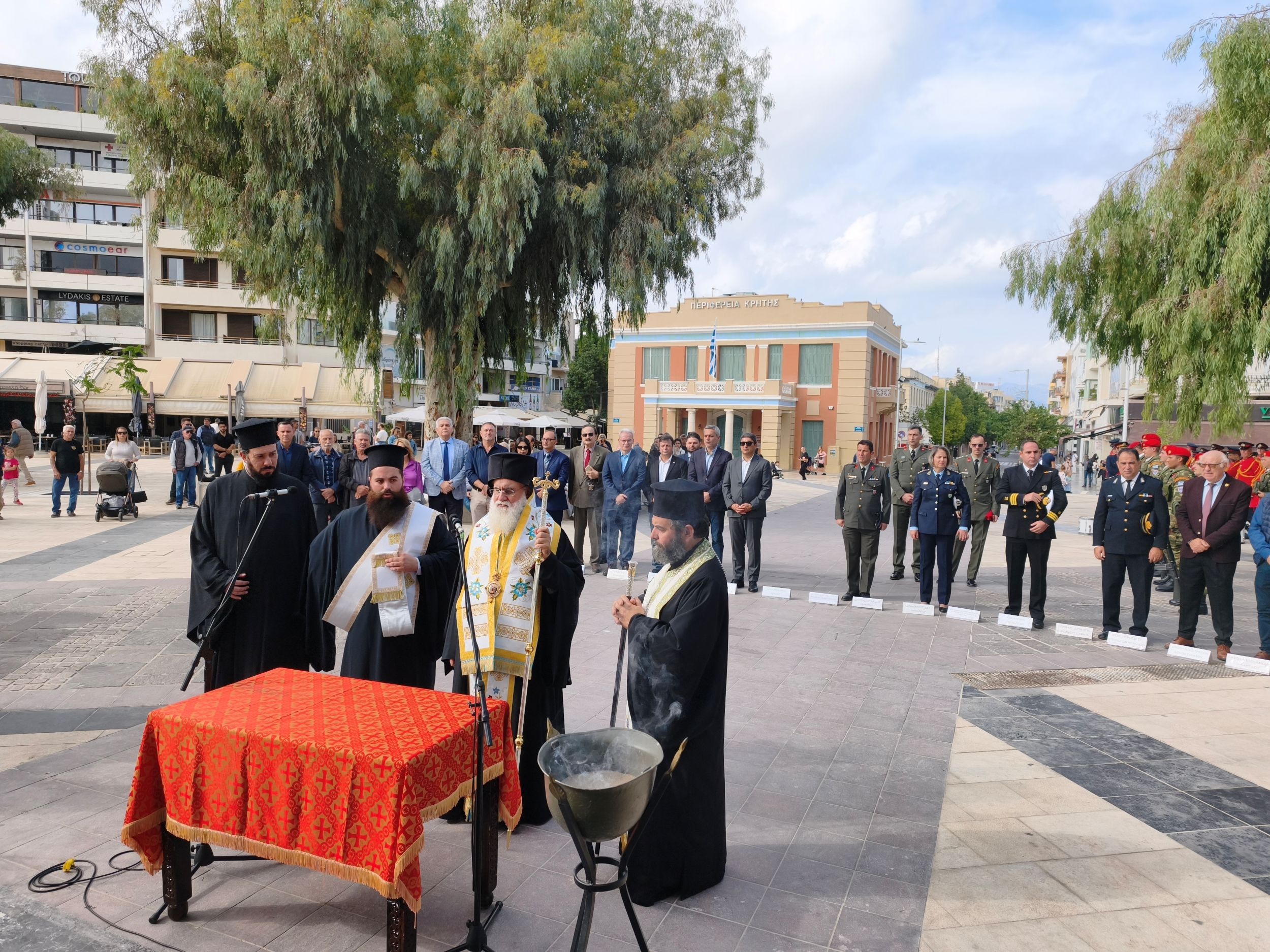 Την επιμνημόσυνη δέηση τέλεσε ο Θεοφιλέστατος Επίσκοπος Κνωσού κ. Μεθόδιος Βερνιδάκης, ενώ στεφάνια κατέθεσαν οι βουλευτές Ηρακλείου της Ν.Δ. Ελευθέριος Αυγενάκης, του ΣΥΡΙΖΑ Χάρης Μαμουλάκης, ο Αντιπεριφερειάρχης Ηρακλείου Νίκος Συριγωνάκης, ο Δήμαρχος Ηρακλείου Αλέξης Καλοκαιρινός, εκπρόσωποι στρατιωτικών αρχών, σωμάτων ασφαλείας, κομμάτων, οργανώσεων αποστράτων και φορέων.