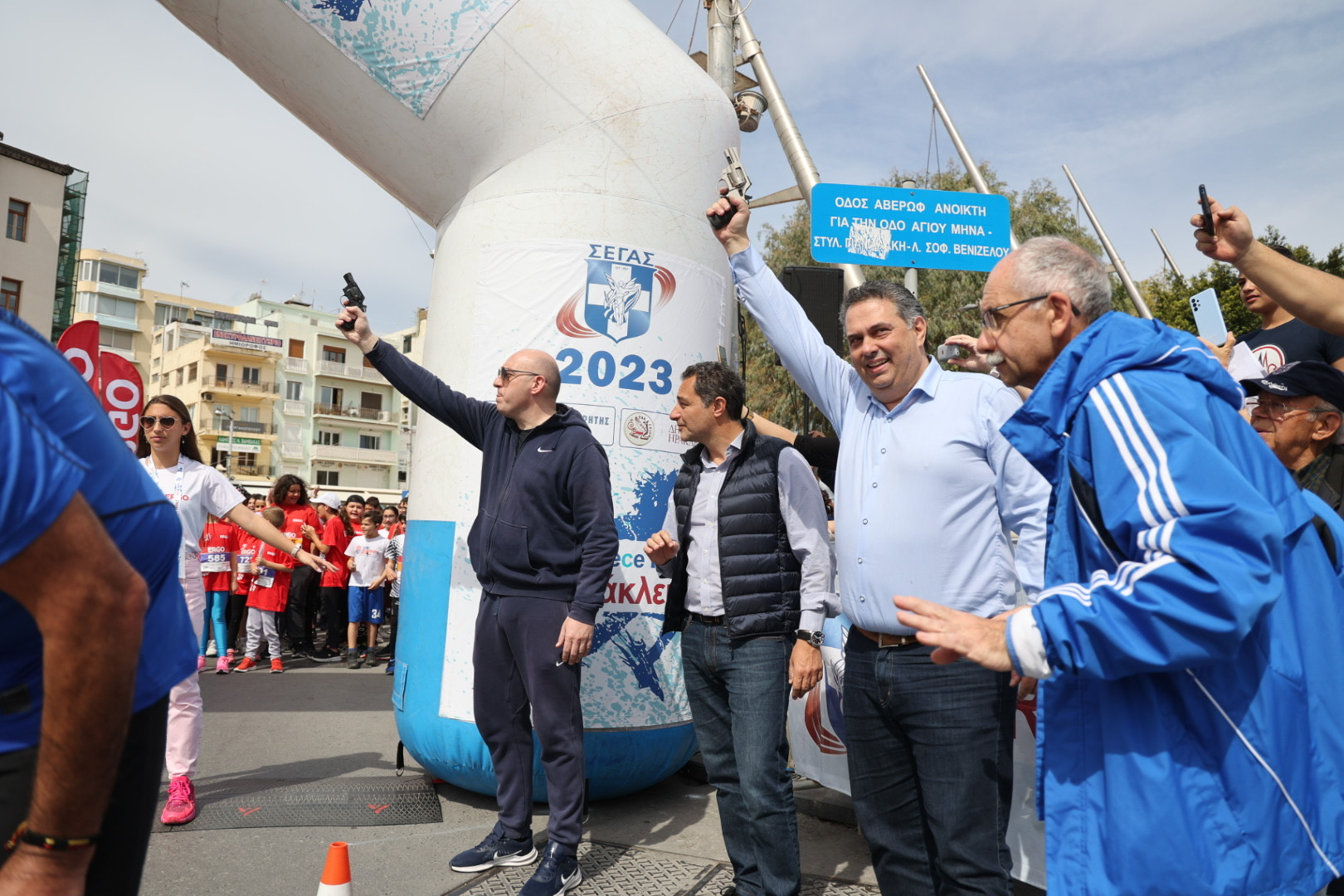 Στα 10 χιλιόμετρα την εκκίνηση έδωσαν η Πρόεδρος του ΣΕΓΑΣ Σοφία Σακοράφα και ο γ.γ. ΣΕΓΑΣ Γιώργος Γιατρουδάκης ενώ στον παιδικό αγώνα ο Αντιπεριφερειάρχης Κρήτης Γιώργος Πιτσούλης και ο Αντιδήμαρχος Ηρακλείου Κώστας Βαρδαβάς.