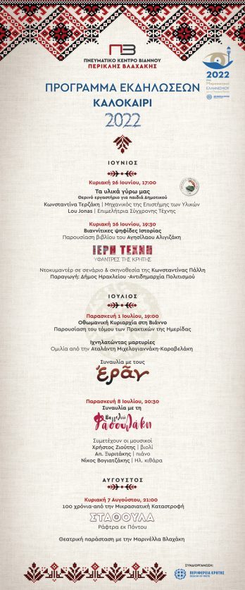 Με θεατρική παράσταση σχετική με τη συμπλήρωση 100 χρόνων από τη Μικρασιατική Καταστροφή ολοκληρώνονται οι «Εκδηλώσεις καλοκαίρι 2022» που οργανώνει το Πνευματικό Κέντρο Βιάννου «Περικλής Βλαχάκης» με τη συνδιοργάνωση της Περιφέρειας Κρήτης.