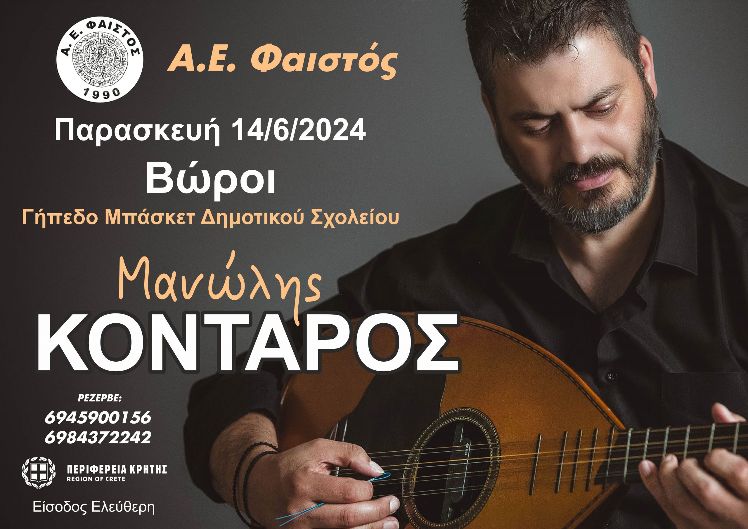 Επιπλέον θα πραγματοποιηθεί μουσική εκδήλωση με τον Μανώλη Κονταρό την Παρασκευή 14 Ιουνίου στις 10 το βράδυ στο γήπεδο μπάσκετ του δημοτικού σχολείου στους Βώρους.