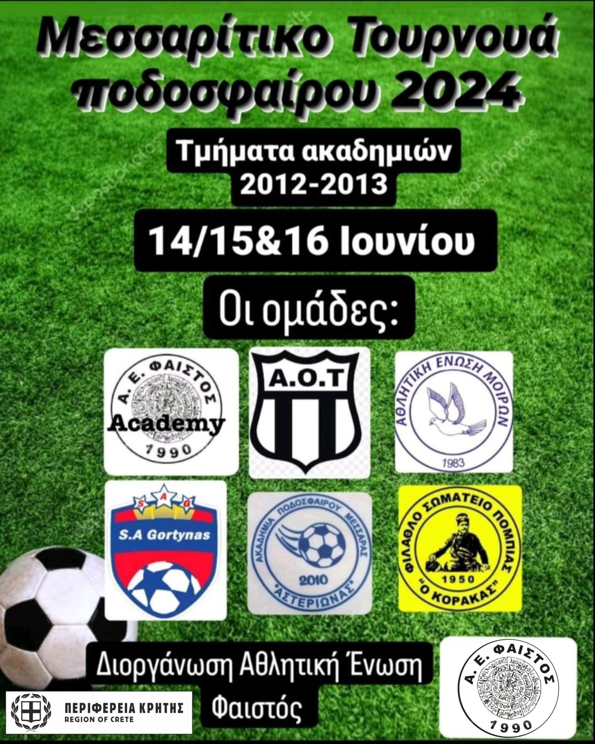 Η Αθλητική Ένωση Φαιστού διοργανώνει το Μεσσαρίτικο τουρνουά ποδοσφαίρου 2024 με τη στήριξη της Περιφέρειας Κρήτης την Παρασκευή 14 Ιουνίου, Σάββατο 15 Ιουνίου και Κυριακή 16 Ιουνίου από τις 18.00 έως τις 22.00 στο γήπεδο Βώρων. Θα συμμετέχουν τα τμήματα των ακαδημιών 2012-2013.