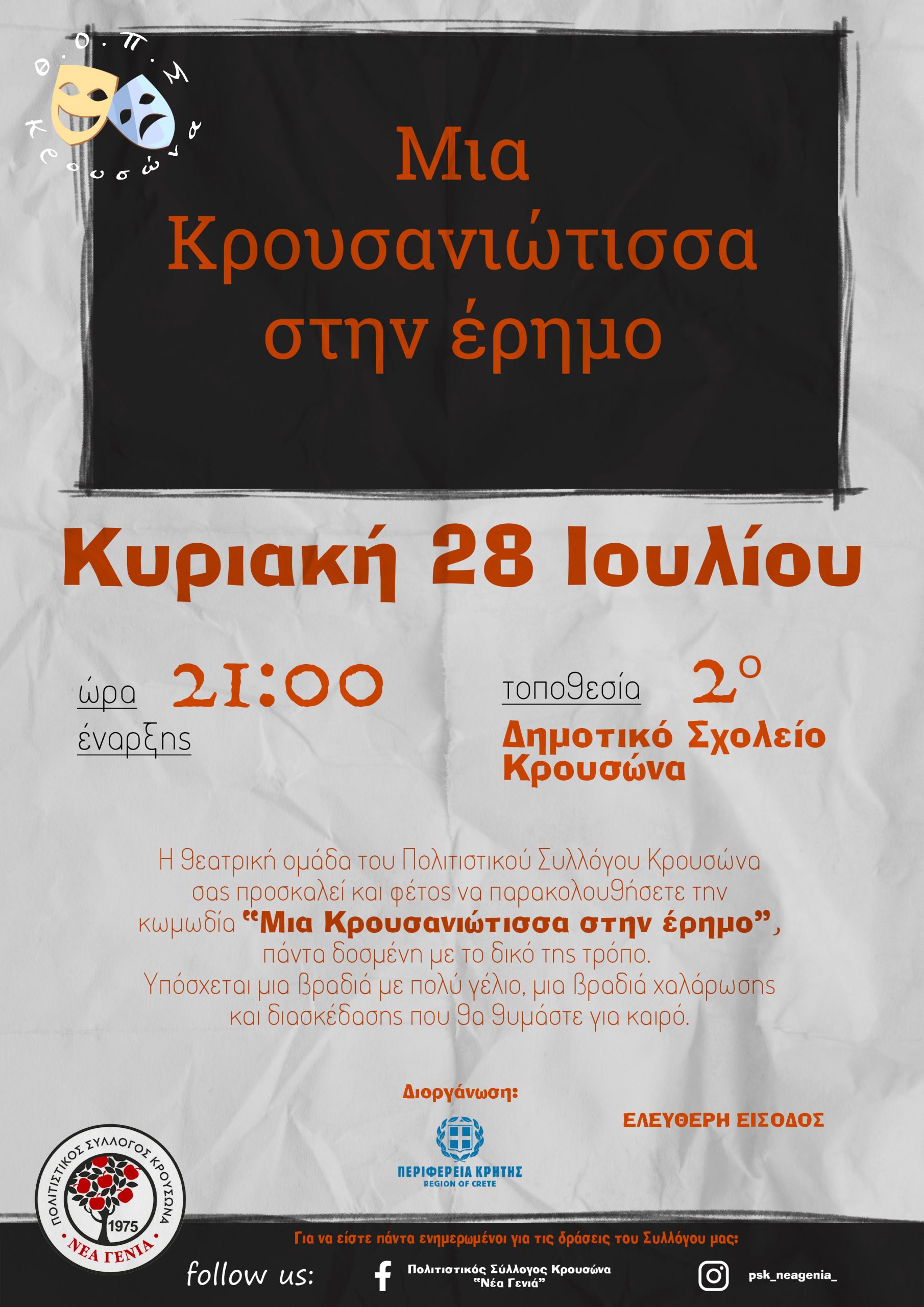 Η θεατρική ομάδα του Πολιτιστικού Συλλόγου Κρουσώνα “Νέα Γενιά” παρουσιάζει την κωμωδία “Μια Κρουσανιώτισσα στην έρημο” σε δύο παραστάσεις με την στήριξη της Περιφέρειας Κρήτης.