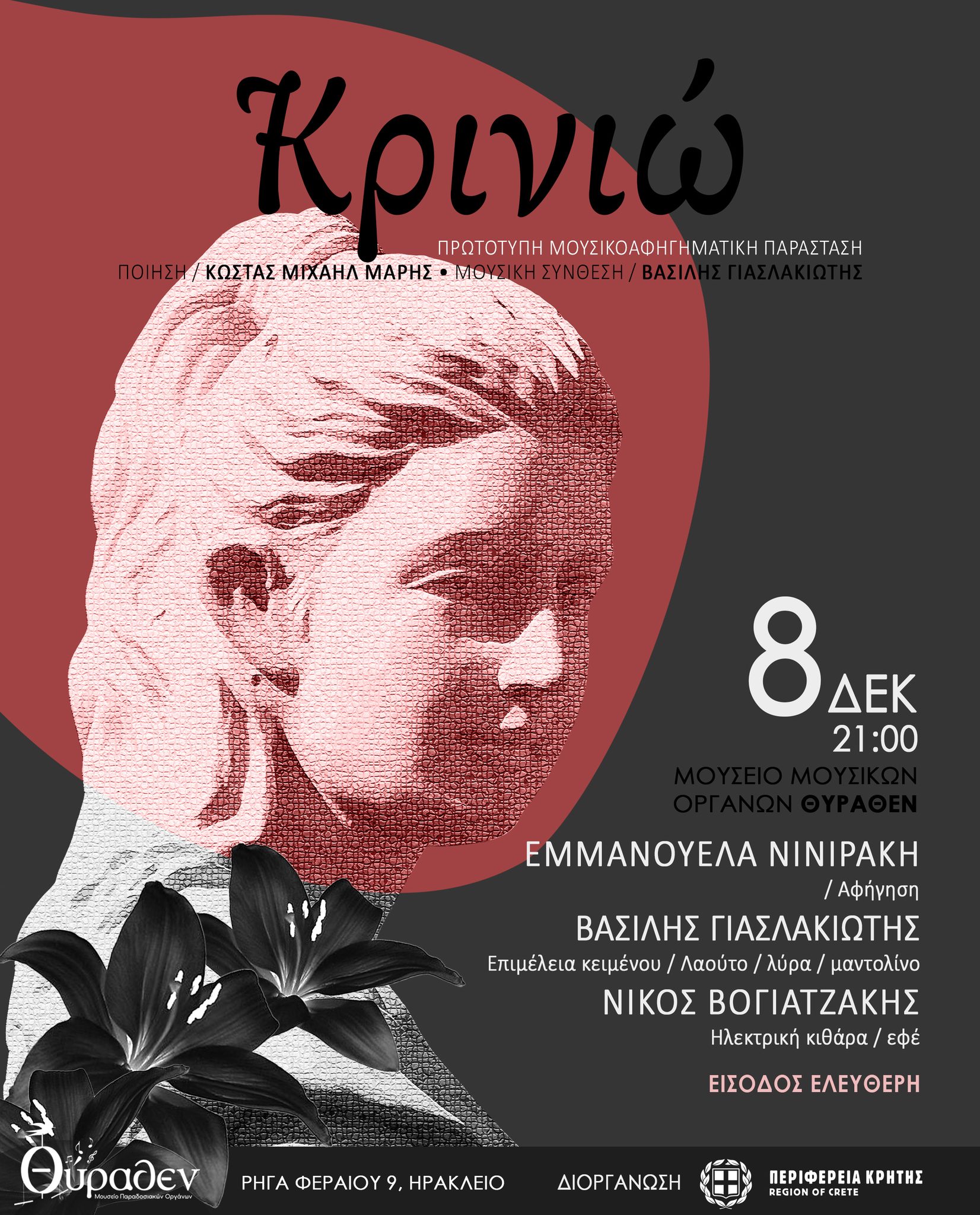 Η μουσικοθεατρική παράσταση «Κρινιώ» παρουσιάζεται με την υποστήριξη της Περιφέρειας Κρήτης, στις 8 Δεκεμβρίου 2025, στις 9:00μ.μ., στο Μουσείο Μουσικών Οργάνων «Θύραθεν» και στις 9 Δεκεμβρίου 2025, στις 9:00μ.μ., στην Αίθουσα Πολλαπλών Χρήσεων Νηπιαγωγείου Τυμπακίου.