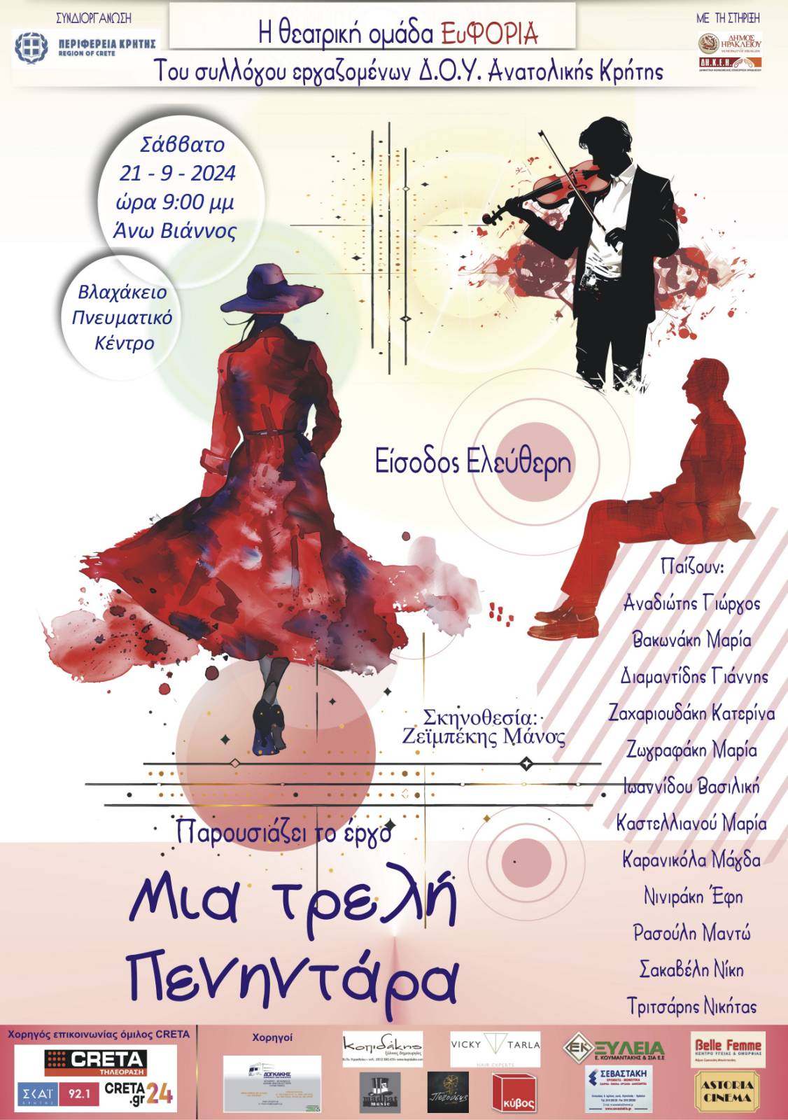 Η παράσταση θα πραγματοποιηθεί στις 21 Σεπτεμβρίου ώρα 21.00 στο Βλαχάκειο Πνευματικό Κέντρο Άνω Βιάννου.