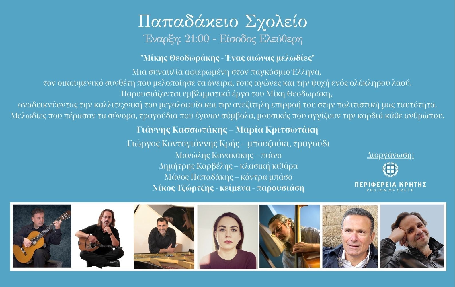 «Μίκης Θεοδωράκης – Ένας αιώνας μελωδίες» Συναυλία αφιερωμένη στα 100 χρόνια από τη γέννηση του μεγάλου Έλληνα συνθέτη-Με την στήριξη της Περιφέρειας Κρήτης