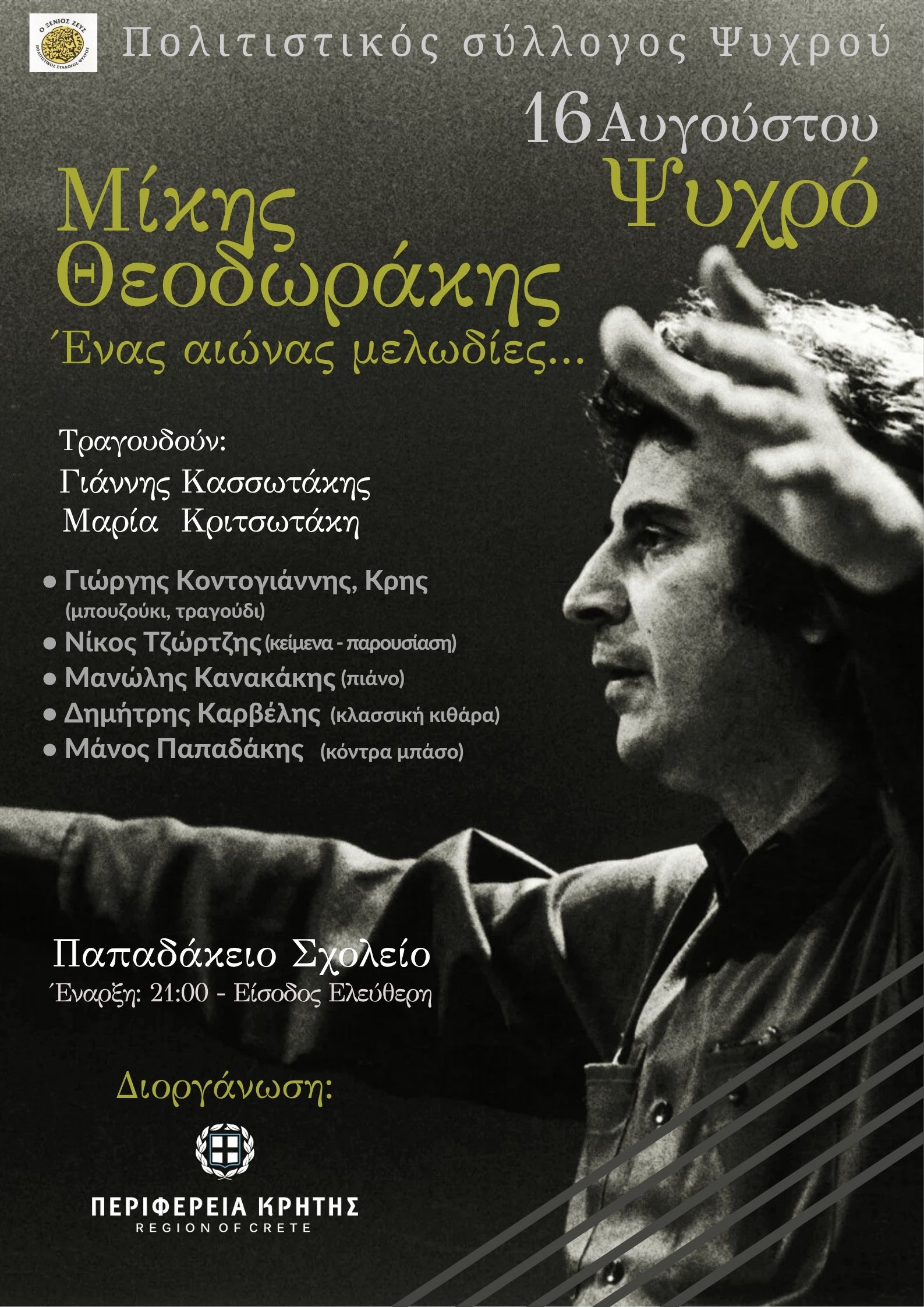 Στο πλαίσιο των καλοκαιρινών εκδηλώσεων  ” ΚΖ’ ΔΙΚΤΑΙΑ 2025″ του  Πολιτιστικού Συλλόγου Ψυχρού ” ο Ξένιος Ζευς”, με την στήριξη της Περιφέρειας Κρήτης,  διοργανώνει μια ξεχωριστή συναυλία, αφιερωμένη στην επέτειο των 100 χρόνων από τη γέννηση του Μίκη Θεοδωράκη.