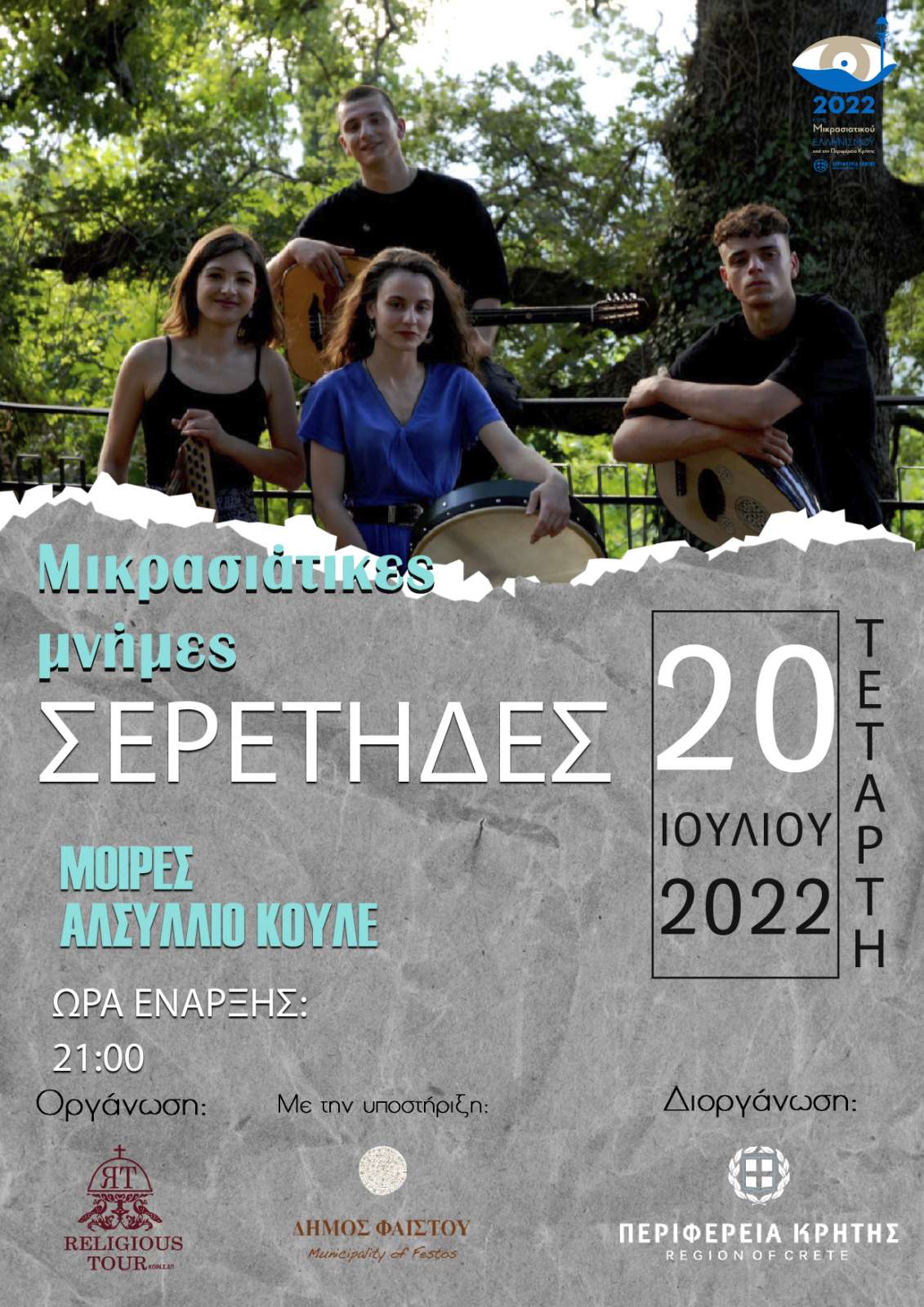 Η Περιφέρεια Κρήτης διοργανώνει συναυλία μικρασιάτικης μουσικής με το μουσικό σχήμα Σερέτηδες στις 20 Ιουλίου 2022 στο Αλσύλλιο Κούλε Μοιρών.