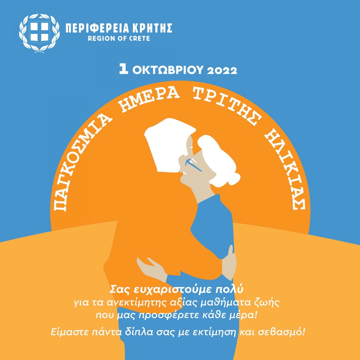 Επίσης, η Περιφέρεια Κρήτης-Διεύθυνση Κοινωνικής Μέριμνας, με αφορμή τον εορτασμό για την Παγκόσμια Ημέρα Τρίτη Ηλικίας διοργανώνει την Τρίτη, 4 Οκτωβρίου και ώρα 10:00π.μ. με 2:30μ.μ την Ημερίδα «Υγιής και Ενεργός Γήρανση: Πολιτικές, Προκλήσεις και Προτεραιότητες». Η Ημερίδα θα πραγματοποιηθεί στο Ξύλινο Αμφιθέατρο της Σχολής Επιστημών Υγείας του Ελληνικού Μεσογειακού Πανεπιστημίου, με τη συμμετοχή διακεκριμένων ακαδημαϊκών, επιστημόνων υγείας και κοινωνικής φροντίδας, ερευνητών/-τριών και στελεχών κοινωνικών υπηρεσιών, με σκοπό την ανάδειξη πολιτικών, θετικών μέτρων, προγραμμάτων και καινοτόμων παρεμβάσεων για την προαγωγή της υγιούς και ενεργού γήρανσης σε τοπικό και περιφερειακό επίπεδο.