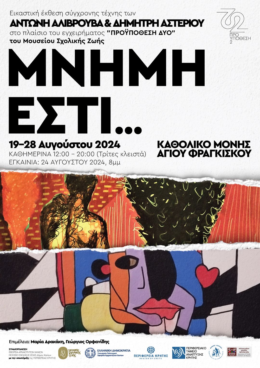 «ΜΝΗΜΗ ΕΣΤΙ…» ονομάζεται η εικαστική έκθεση σύγχρονης τέχνης στα Χανιάτων των Αντώνη Αλιβρούβα και Δημήτρη Αστερίου που θα φιλοξενηθεί στο Καθολικό της Μονής του Αγίου Φραγκίσκου, στα Χανιά, 19-28 Αυγούστου 2024 με τη στήριξη της Περιφέρειας Κρήτης