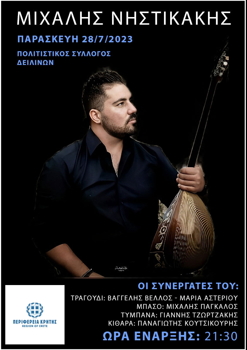 - Συναυλία με τον Μιχάλη Νηστικάκη, στα Δειλινά, με την υποστήριξη του Πολιτιστικού Συλλόγου Δειλινών. Στις 9.30 μ.μ.