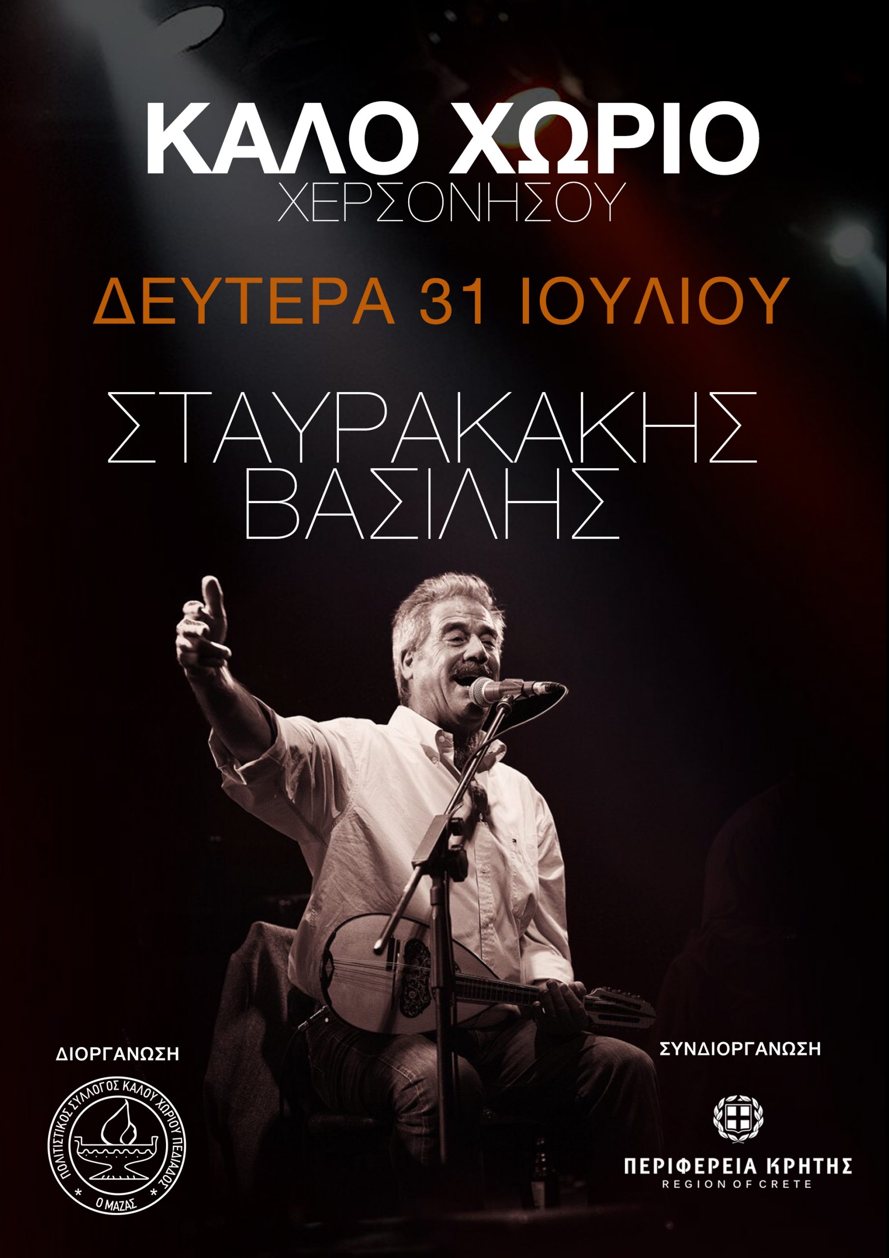 - Κρητική βραδιά με τον Βασίλη Σταυρακάκη στο Καλό Χωριό του Δ. Χερσονήσου. Με την υποστήριξη του Πολιτιστικού Συλλόγου Καλού Χωριού. Στις 9.00 μμ.