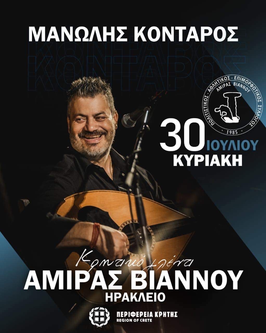 - Κρητικό Γλέντι με τον Μανόλη Κονταρό, στον Αμιρά Βιάννου. Με την υποστήριξη του Πολιτιστικού, Αθλητικού, Επιμορφωτικού Συλλόγου Αμιρά Βιάννου. Στις 9.00 μ.μ.