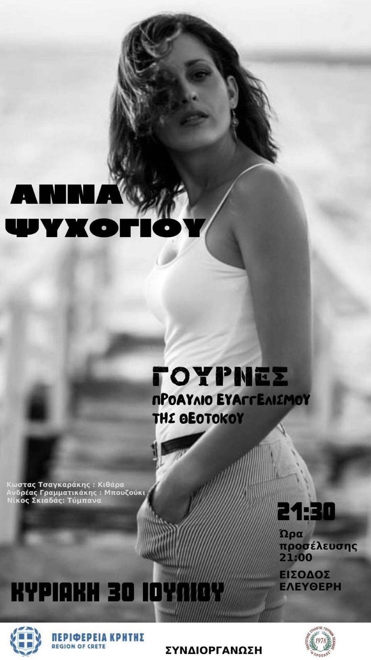 - Συναυλία με την Άννα Ψυχογιού, στον προαύλιο χώρο του Ι.Ν. Ευαγγελισμού της Θεοτόκου, με την υποστήριξη του Πολιτιστικού Συλλόγου Γουρνών «Η Πρόοδος». Στις 9.30 μ.μ.