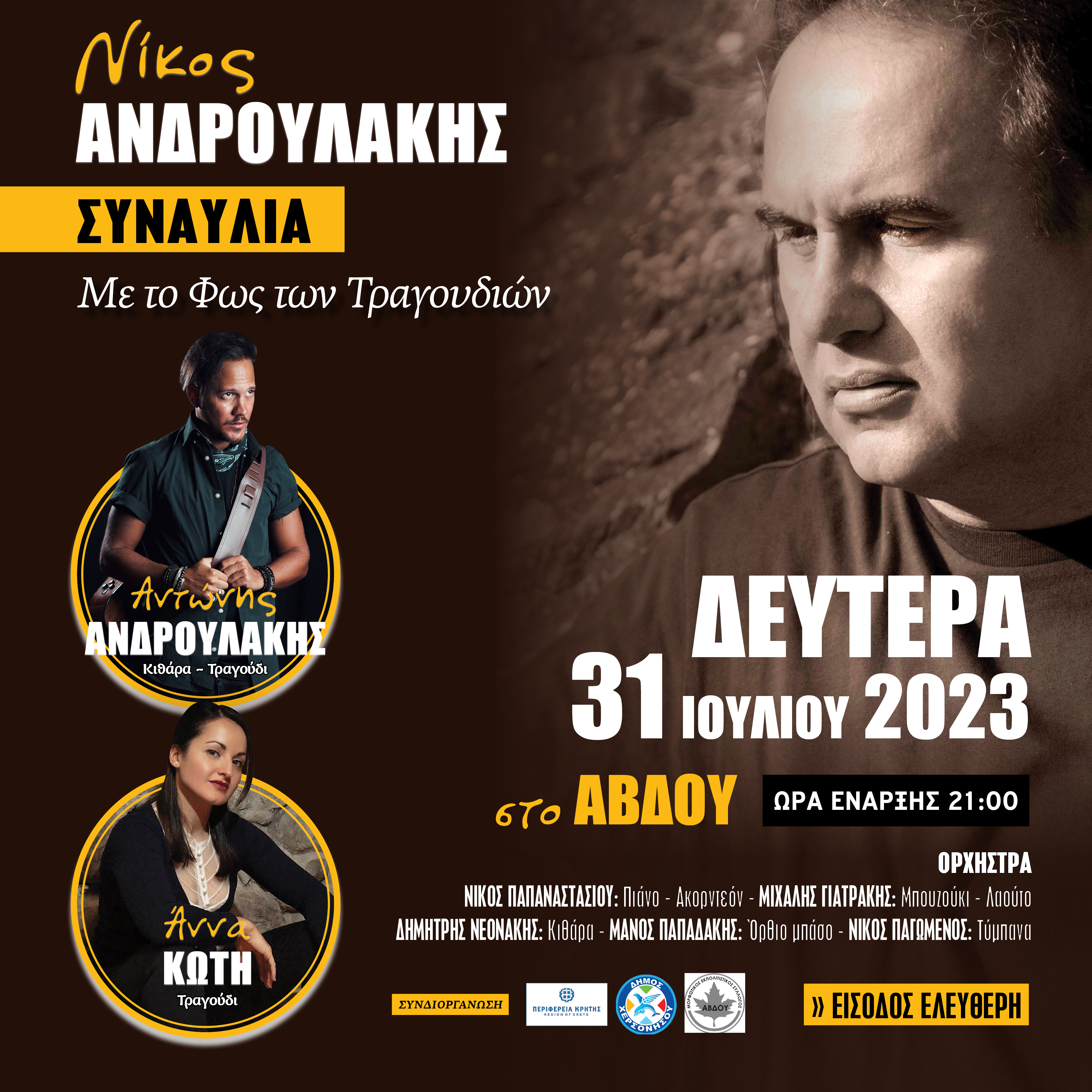 - Συναυλία με τον Νίκο Ανδρουλάκη, με τίτλο «Με το Φώς των Τραγουδιών» στο Αβδού του Δήμου Χερσονήσου. Με την υποστήριξη του Πολιτιστικού Συλλόγου Αβδού και του Δήμου Χερσονήσου. Με πολυμελή ορχήστρα, τον Αντώνη Ανδρουλάκη στην κιθάρα και το τραγούδι και την Άννα Κώτη στο τραγούδι. Στις 9.00 μ.μ.