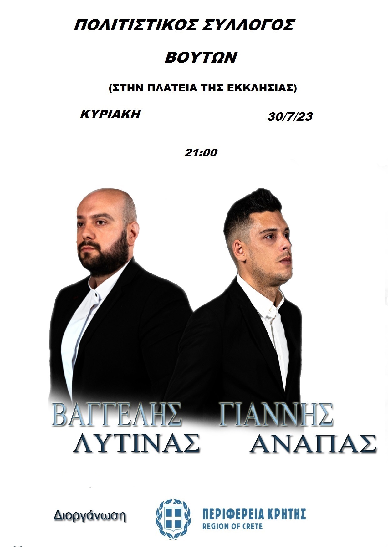 - Συναυλία με τον Γιάννη Ανάπα, στις Βούτες, στο προαύλιο της εκκλησίας. Με την υποστήριξη του Πολιτιστικού Συλλόγου Βουτών. Στις 9.00 μ.μ.