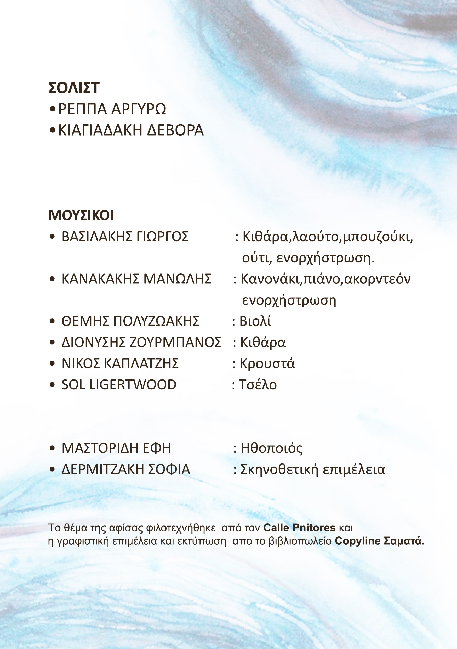 Μουσικοί: Βασιλάκης Γιώργος (μπουζούκι ,λαούτο ,ούτι ,κλασσική κιθάρα -ενορχήστρωση )