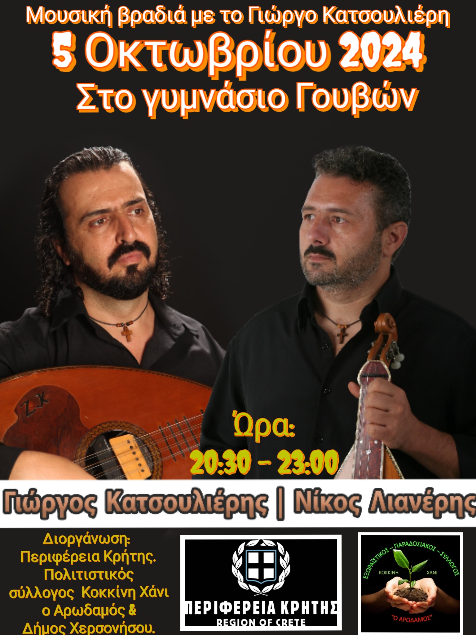 Μουσική βραδιά με τον Γιώργο Κατσουλιέρη και το συγκρότημα του θα πραγματοποιηθεί το Σάββατο 5 Οκτωβρίου στο γυμνάσιο Γουβών με ελεύθερη είσοδο.