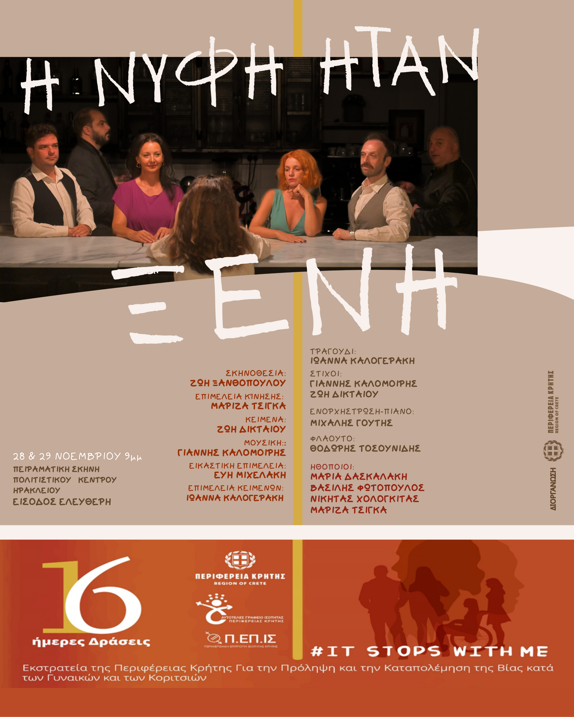 Την Παρασκευή 28 και το Σάββατο 29 Νοεμβρίου 2025, παρουσιάζεται η μουσικό-θεαττική παράσταση «Η νύφη ήταν ξένη», στην Πειραματική Σκηνή, του Πολιτιστικού Συνεδριακού Κέντρου Ηρακλείου, στις 9:00μ.μ., στο πλαίσιο των 16ήμερων Δράσεων της Περιφέρειας Κρήτης για την Πρόληψη και την Αντιμετώπιηση της Βίας κατά των Γυναικών και των Κοριτσιών, με ελεύθερη είσοδο για το κοινό.