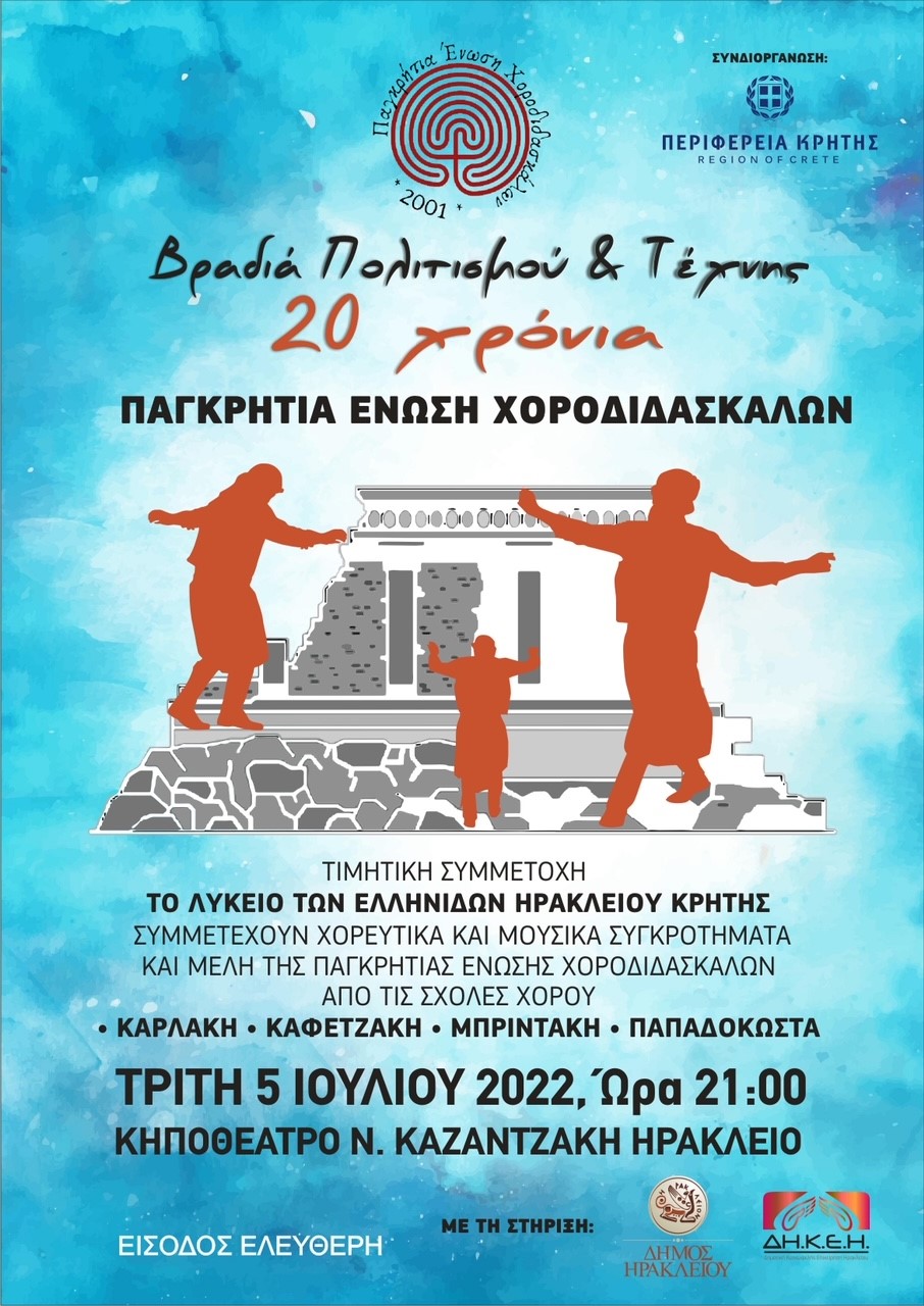 Μουσικοχορευτική εκδήλωση για τη συμπλήρωση 20 χρόνων της Παγκρήτιας Ένωσης Χοροδιδασκάλων διοργανώνει η Ένωση με τη συνδιοργάνωση της Περιφέρειας Κρήτης και τη στήριξη του Δήμου Ηρακλείου.