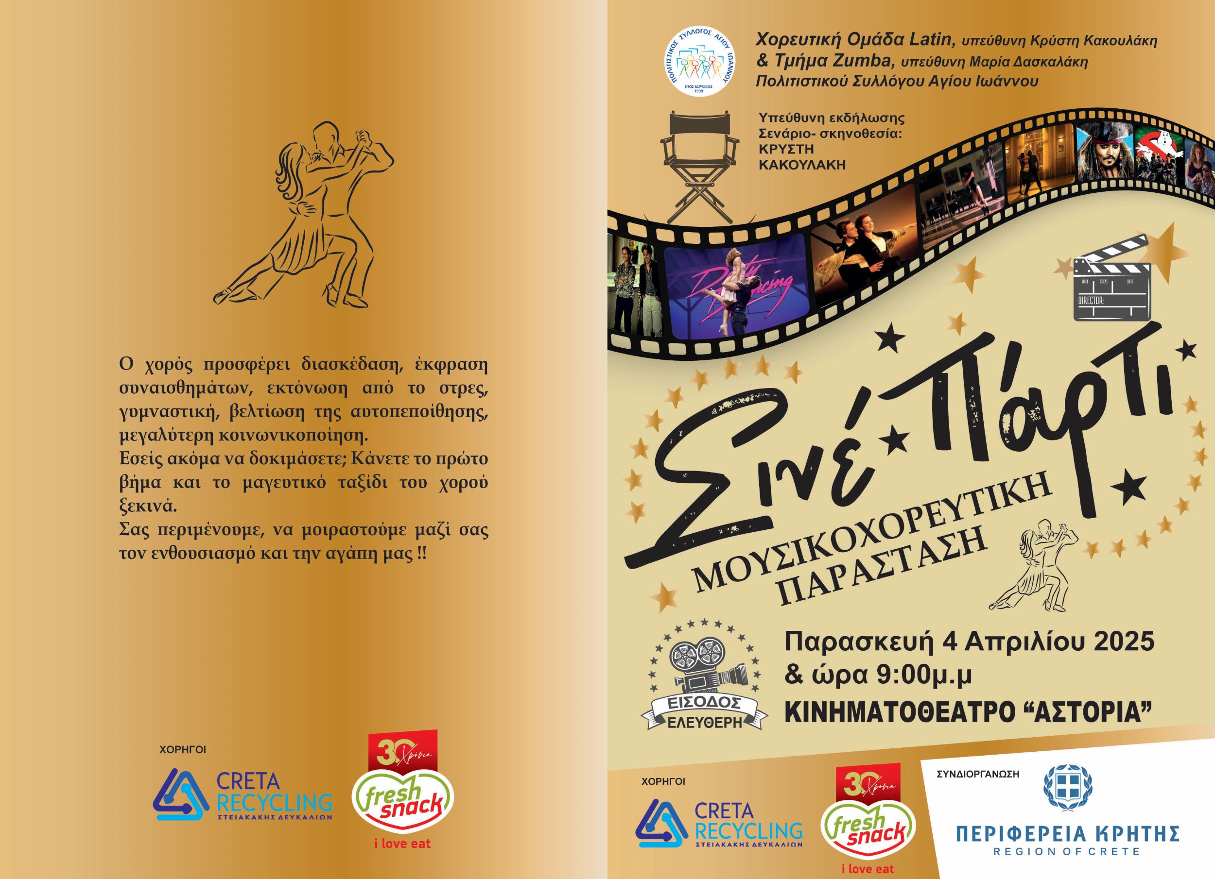 Ο Πολιτιστικός Σύλλογος Αγ. Ιωάννη με την χορευτική του ομάδα LATIN και το τμήμα ZUMBA συνδιοργανώνει με την Περιφέρεια Κρήτης τη μουσικοχορευτική παράσταση με τίτλο «Σινέ-Πάρτι».