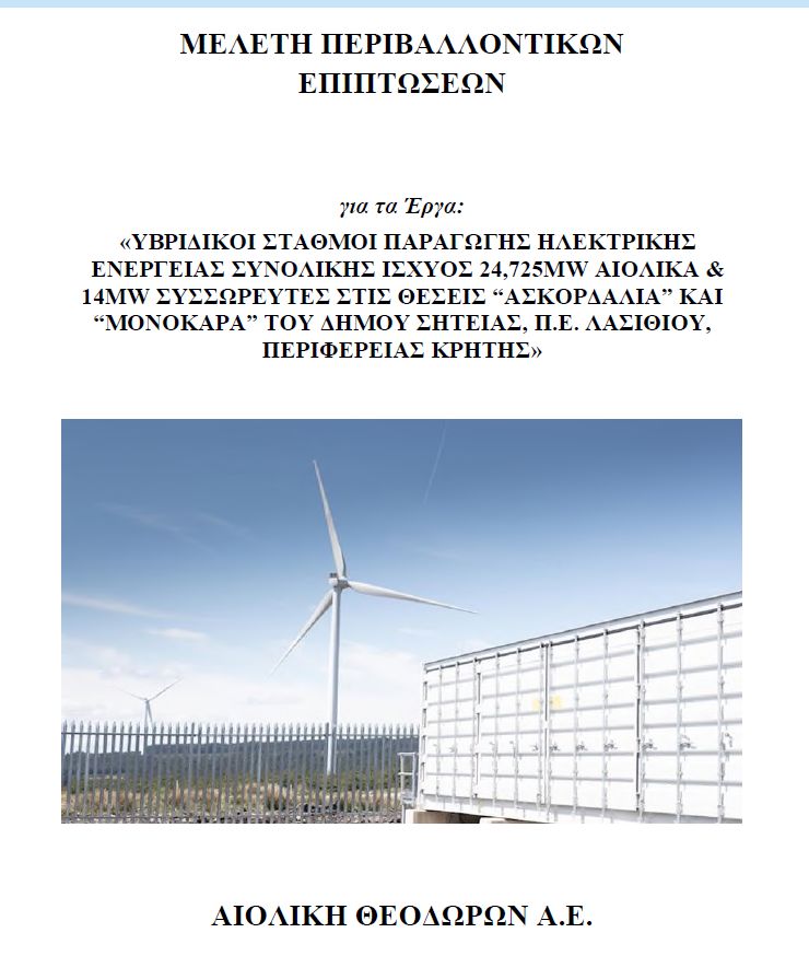 Πρόσκληση για συμμετοχή στην Ανοιχτή Διαβούλευση για τη ΜΠΕ του έργου «Υβριδικοί Σταθμοί Παραγωγής Ηλεκτρικής Ενέργειας (ΥΣΠΗΕ) στις θέσεις “Ασκορδαλιά” και “Μονοκαρια” στο Δήμο Σητείας, με Φορέα την ΑΙΟΛΙΚΗ ΘΕΟΔΩΡΩΝ Α.Ε.».