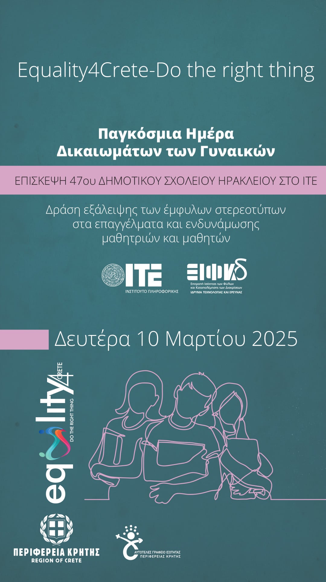 Με αφορμή την Παγκόσμια Ημέρα των Δικαιωμάτων των Γυναικών πραγματοποιήθηκε σήμερα, Δευτέρα, 10 Μαρτίου 2025, από την Περιφέρεια Κρήτης, Αυτοτελές Γραφείο Ισότητας, σε συνεργασία με την Επιτροπή Ισότητας και Καταπολέμησης των Διακρίσεων του Ιδρύματος Τεχνολογίας και Έρευνας (ΙΤΕ) δράση για 40 μαθητές και μαθήτριες του 47ου Δημοτικού Σχολείου Ηρακλείου στο ΙΤΕ.