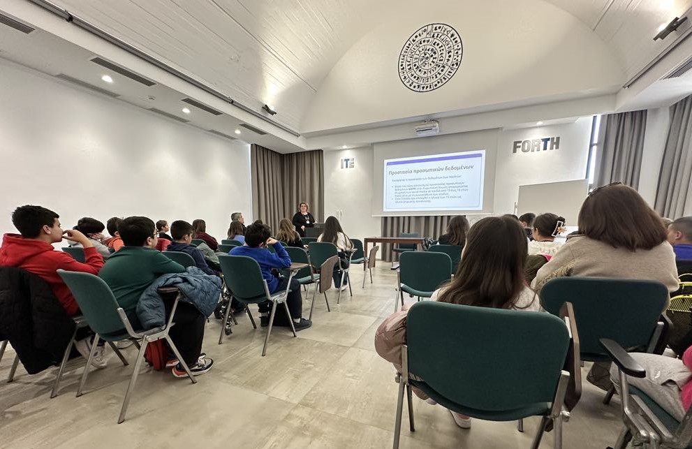 Τα παιδιά και τους/τις εκπαιδευτικούς υποδέχθηκε ο Διευθυντής του Ινστιτούτου Πληροφορικής καθηγητής Δημήτρης Πλεξουσάκης και η Αντιπεριφερειάρχης Γωγώ Μηλάκη. Πραγματοποιήθηκε ξενάγηση στο Ινστιτούτο Πληροφορικής και στο Πρόγραμμα Διάχυτης Νοημοσύνης του Ινστιτούτου Πληροφορικής και ενημέρωση για την ασφαλή πλοήγηση στο διαδίκτυο από το Ελληνικό Κέντρο Ασφαλούς Διαδικτύου «saferinternet4kids.gr» και την Μελτίνη Φραγκιουδάκη.