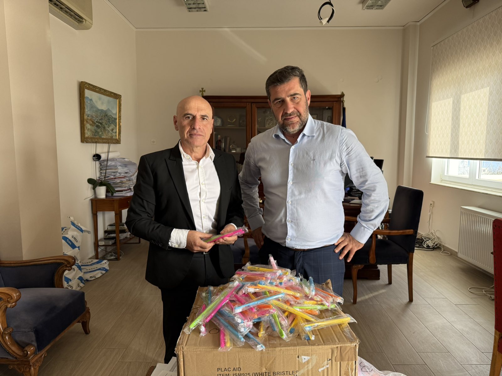 Στο πλαίσιο της προαγωγής υγείας και πρόληψης στους μαθητές-μαθήτριες στις πρώτες τάξεις στα Δημοτικά σχολεία Λασιθίου, παραδόθηκαν από τον Αντιπεριφερειάρχη Γιάννη Ανδρουλάκη 1.600 οδοντόβουρτσες, στον Διευθυντή της Πρωτοβάθμιας Εκπαίδευσης Λασιθίου Γιώργο Μαμάκη.