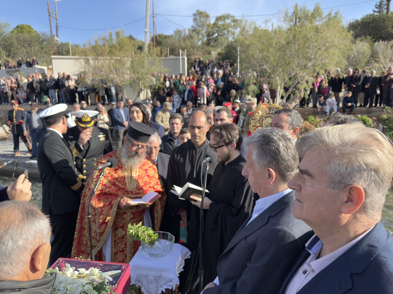Η πομπή κατέληξε στον μικρό προβλήτα, στον Όρμο του Αγίου Νικολάου, ακριβώς κάτω από τον ιστορικό ναό, όπου τελέστηκε ο Αγιασμός των Υδάτων. Τιμές απέδωσε η πυραυλάκατος (ΤΠΚ) του Πολεμικού Ναυτικού «ΚΑΡΑΘΑΝΑΣΗΣ», η οποία κατέπλευσε στο λιμάνι της πόλης με αφορμή τον εορτασμό, ενώ παρόντες ήταν ο Κυβερνήτης του σκάφους, εκπρόσωποι του Πολεμικού Ναυτικού, ο Λιμενάρχης Αγίου Νικολάου και στελέχη του Λιμενικού Σώματος.
