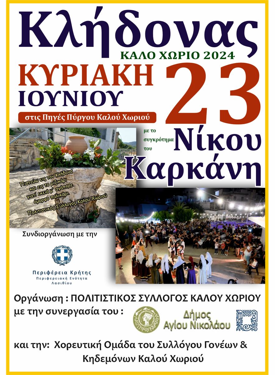 O Πολιτιστικός Σύλλογος Καλού Χωριού “Το Ίστρον” , στα πλαίσια των καλοκαιρινών εκδηλώσεων για το 2024, διοργανώνει σε συνεργασία με την Περιφέρεια Κρήτης – Περιφερειακή Ενότητα Λασιθίου , την εκδήλωση “Κλήδονας Καλό Χωριό 2024”. Η εκδήλωση θα πραγματοποιηθεί στις πηγές του οικισμού Πύργου Καλού Χωριού την Κυριακή 23 Ιουνίου 2024 και ώρα 21:00.