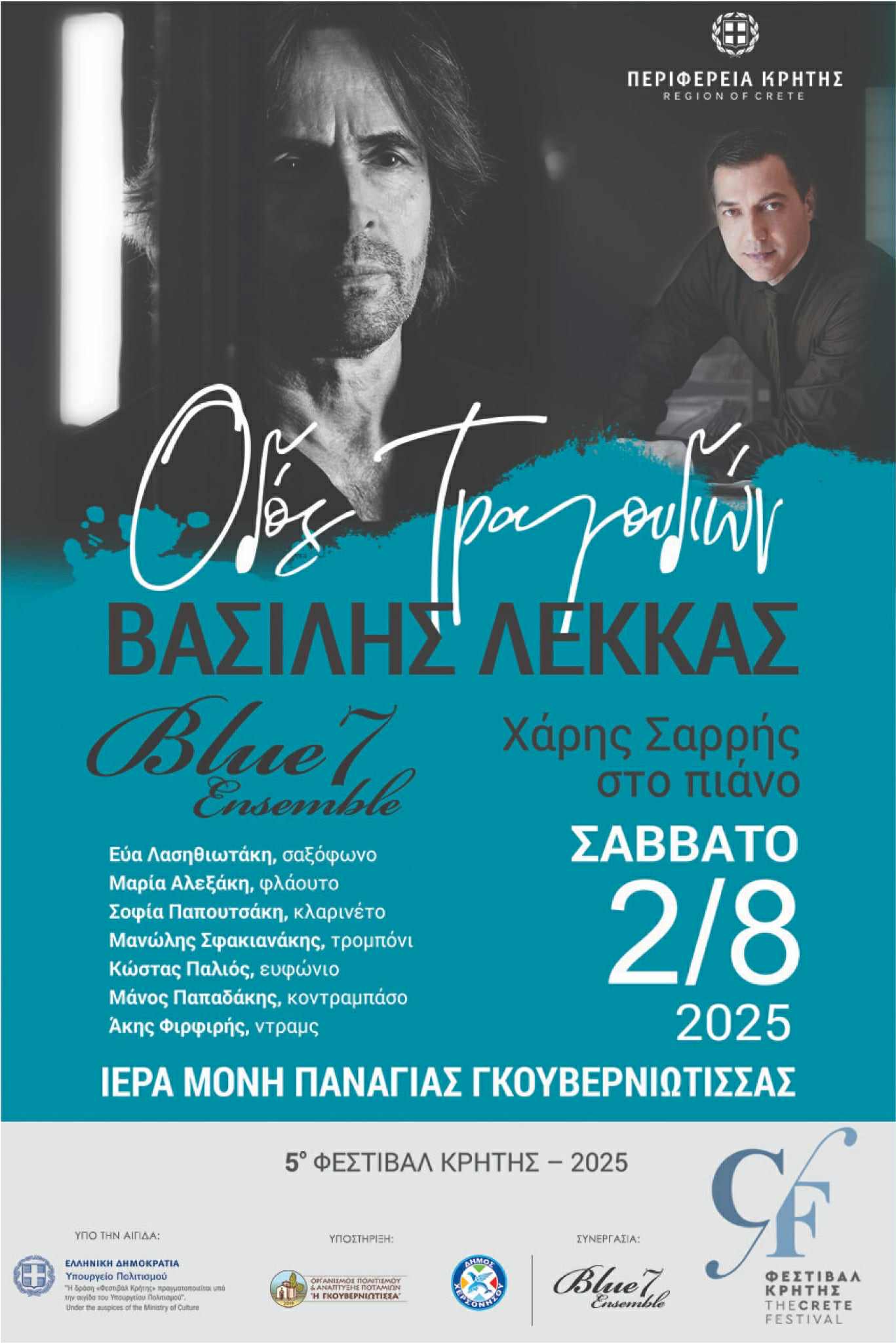 Ο εξαιρετικός ερμηνευτής Βασίλης Λέκκας συμπράττει στο Ηράκλειο με το μοναδικό Blue7 Ensemble και τον Χάρη Σαρρή στο πιάνο. Στη συναυλία θα ακουστούν έργα των Μίκη Θεοδωράκη, Μάνου Χατζιδάκι, αλλά και πιο σύγχρονων συνθετών, όπως του Γιάννη Σπάθα, Γιώργου Τρανταλίδη, Παναγιώτη Στεργίου, κ.α.