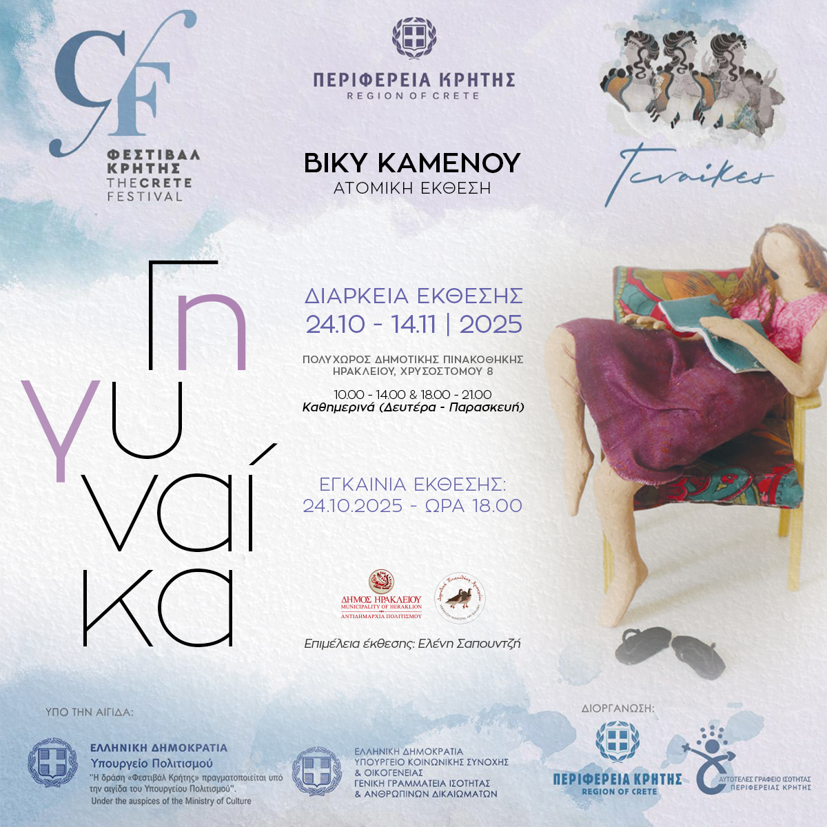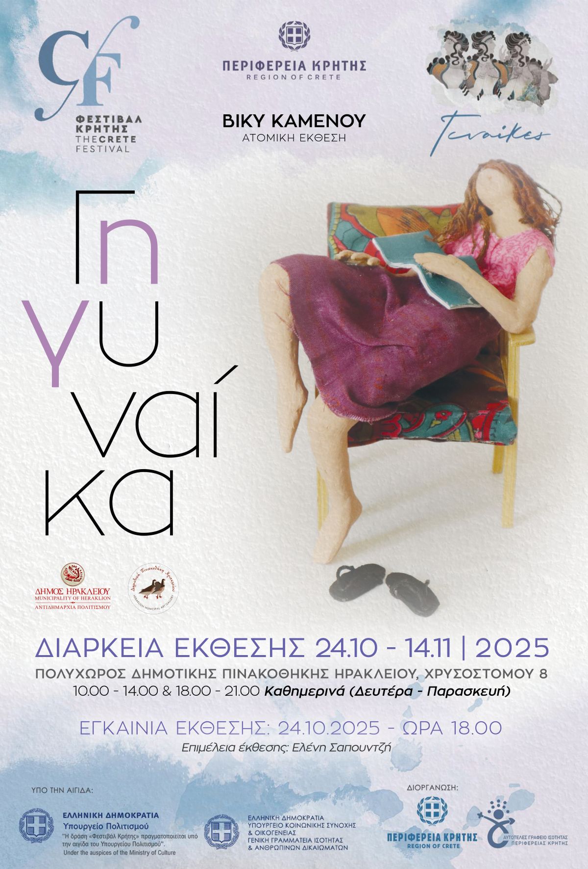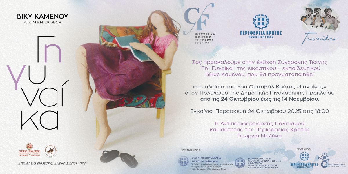«Γη-Γυναίκα», είναι ο τίτλος της ατομικής έκθεσης της Βίκυς Καμένου, που θα παρουσιαστεί στη Δημοτική Πινακοθήκη Ηρακλείου (οδό Χρυσοστόμου 8) από τις 24/10/2025 έως τις 14/11/2025 στο πλαίσιο της παράλληλης δράσης του 5ου Φεστιβάλ Κρήτης «Γυναίκες», που υλοποιείται για 2η συνεχόμενη χρονιά, με την υποστήριξη του Αυτοτελούς Γραφείου Ισότητας της Περιφέρειας Κρήτης. Την επιμέλεια της έκθεσης υπογράφει η ιστορικός τέχνης Ελένη Σαπουντζή. Τα επίσημα εγκαίνια θα πραγματοποιηθούν την Παρασκευή 24 Οκτωβρίου 2025 και ώρα 18.00.