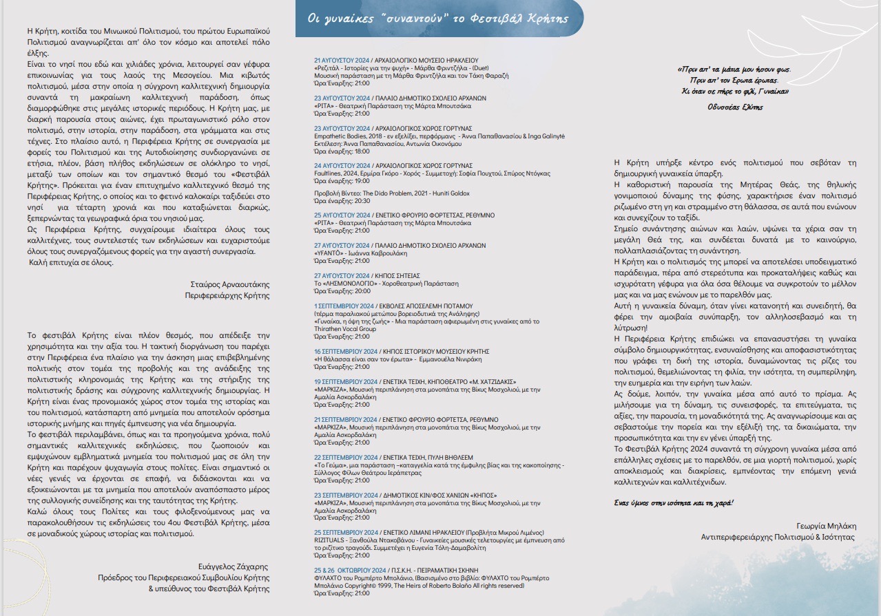 Παρακάτω επισυνάπτεται το αναλυτικό πρόγραμμα της παράλληλης δράσης «Οι γυναίκες συναντούν το Φεστιβάλ Κρήτης».