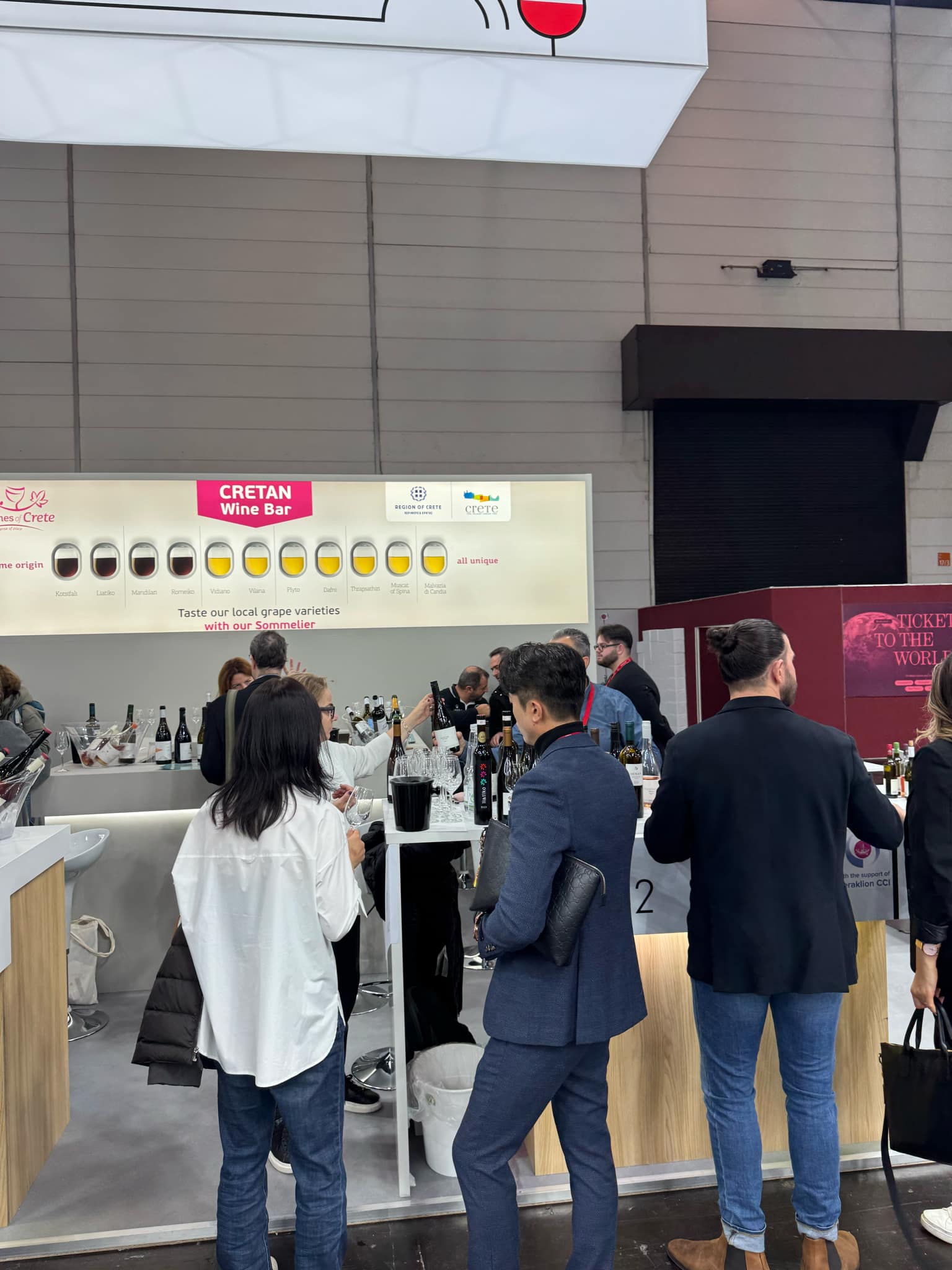 Στο περίπτερο της Κρήτης συμμετείχαν 8 κρητικά οινοποιεία: οινοποιείο Σίλβα – Δασκαλάκη, Οινοποιείο Διαμαντάκη, Οινοποιείο Δουλουφάκη, Οινοποιείο Ζαχαριουδάκη, Ιδαία Οινοποιητική, Οινοποιείο Λουλούδη, Οινοποιείο Ντουράκη και Οινοποιείο Στραταριδάκη. Πλήθος επαγγελματιών επισκέφθηκαν το ενιαίο wine bar που υποστήριζε η οινοχόος Υρώ Κολιακουδάκη Dip WSET, όπου οι επισκέπτες είχαν τη δυνατότητα να δοκιμάσουν ετικέτες από 36 οινοποιεία του νησιού και να πληροφορηθούν για τον Κρητικό αμπελώνα. Το ιδιαίτερο γραφικό που δημιουργήθηκε για να πλαισιώσει την παρουσία των οινοποιών, έδινε χρήσιμες πληροφορίες για τις τοπικές ποικιλίες, τις οινοπαραγωγικές ζώνες ΠΟΠ και ΠΓΕ, αλλά και για την μορφολογία του νησιού.