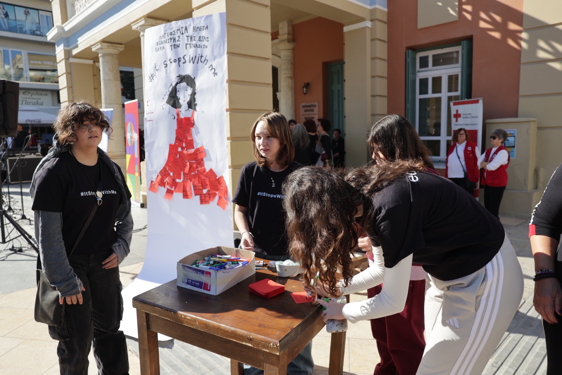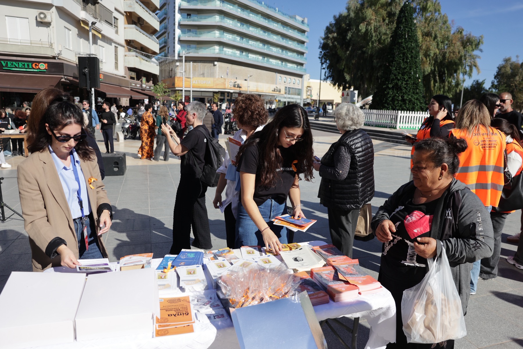 - Ο ενημερωτικός σταθμός από τα στελέχη του Συμβουλευτικού Κέντρου Γυναικών του ΚΕΘΙ, του Ξενώνα Φιλοξενίας Γυναικών του Δήμου Ηρακλείου, του Χαμόγελου του Παιδιού, του Συνδέσμου Μελών Γυναικείων Σωματείων Ηρακλείου και Νομού Ηρακλείου και των Δημοτικών Επιτροπών Ισότητας.