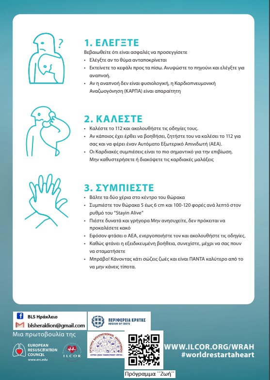 Με αφορμή τον εορτασμό της Παγκόσμιας Ημέρας Επανεκκίνησης της Καρδιάς, το Εργαστήριο Καρδιοπνευμονικής Αναζωογόνησης της Ιατρικής Σχολής του Πανεπιστημίου Κρήτης και η Περιφέρεια Κρήτης συνδιοργανώνουν εκδήλωση για τον εορτασμό της Παγκόσμιας Ημέρας. Η εκδήλωση θα πραγματοποιηθεί τη Δευτέρα 16 Οκτωβρίου 2023 μπροστά από το κτήριο της Περιφέρειας Κρήτης στη πλ. Ελευθερίας, από τις 10 το πρωί  έως τις 4 το απόγευμα. Στόχος η ευαισθητοποίηση των πολιτών για την εκμάθηση της  καρδιοπνευμονικής αναζωογόνησης όπως επίσης  η χρήση αυτόματου εξωτερικού απινιδωτή.