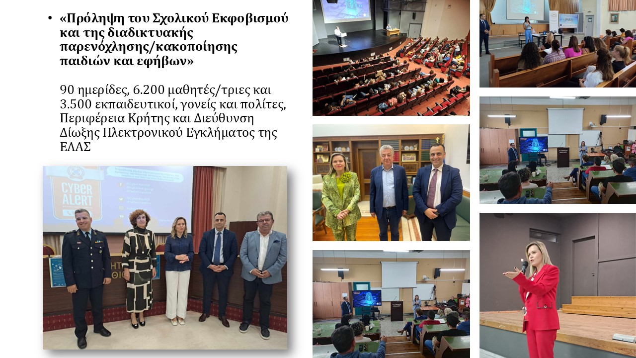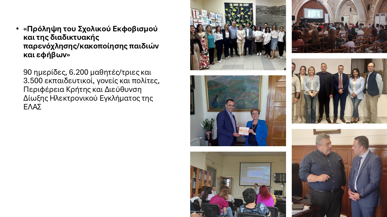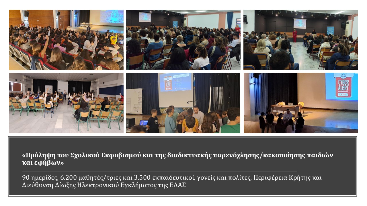 Ολοκληρώθηκε ο 5ος Κύκλος Ενημερωτικών Δράσεων της Περιφέρειας Κρήτης, στο πλαίσιο του «Περιφερειακού Σχεδίου Δράσης Κρήτης για την Ισότητα των Φύλων 2023-2025», για την πρόληψη και αντιμετώπιση του σχολικού εκφοβισμού και της διαδικτυακής παρενόχλησης και κακοποίησης παιδιών και εφήβων, σε συνεργασία με τη Διεύθυνση Δίωξης Ηλεκτρονικού Εγκλήματος της Ελληνικής Αστυνομίας και τον ψυχολόγο της Διεύθυνσης A/Α'(ΥΓ) Δρ. Γεώργιο Νάκο.