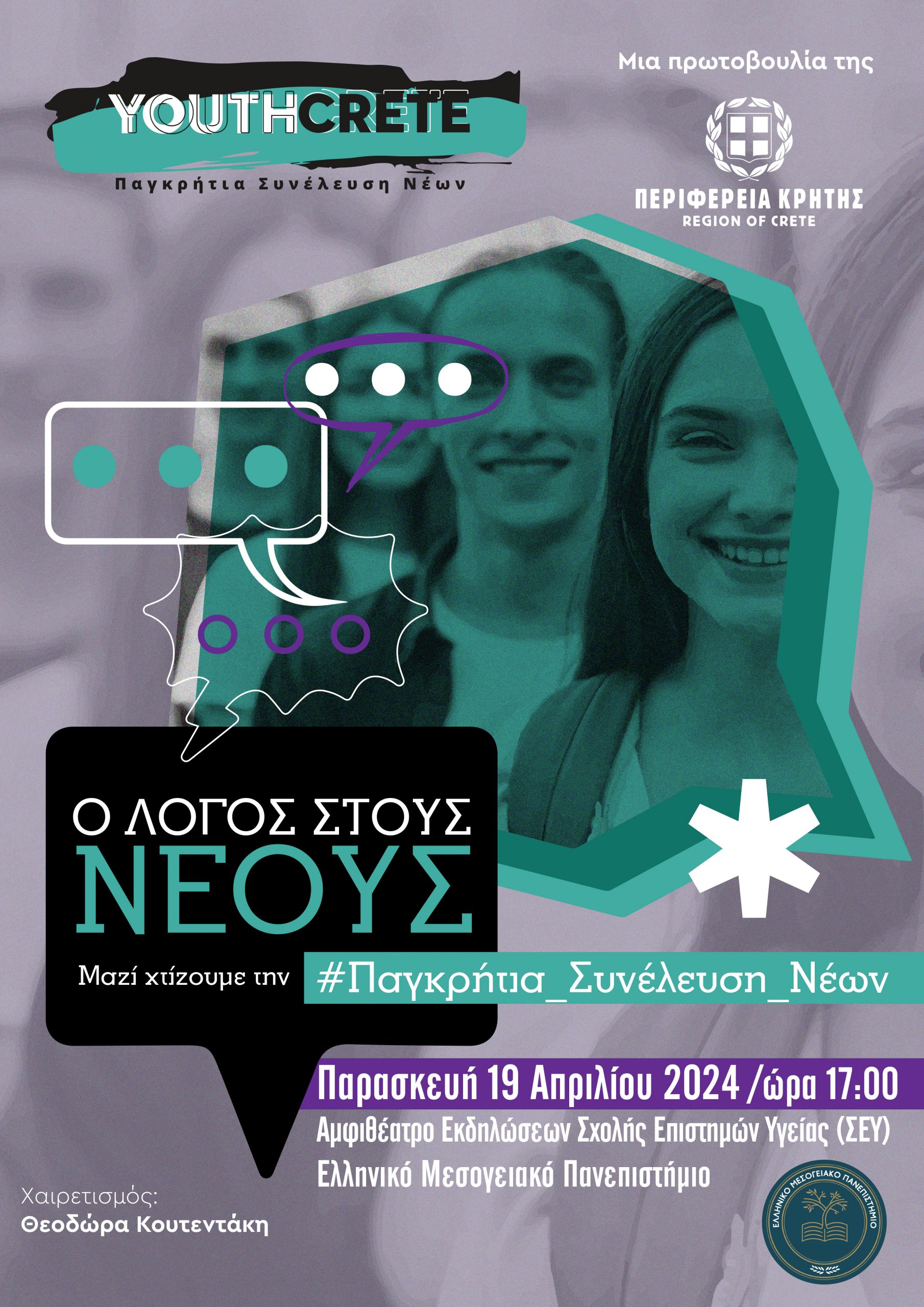 Στο πλαίσιο της Ευρωπαϊκής εβδομάδας νεολαίας (12-19 Απριλίου), η Παγκρήτια Συνέλευση Νέων (Youth Crete) πραγματοποιεί τη μεγαλύτερη μέχρι σήμερα εκδήλωσή της στο Ελληνικό Μεσογειακό Πανεπιστήμιο. Η εκδήλωση θα πραγματοποιηθεί την Παρασκευή 19 Απριλίου και ώρα 17:00 στο Αμφιθέατρο εκδηλώσεων της Σχολής Επιστημών Υγείας (ΣΕΥ) του Ελληνικού Μεσογειακού Πανεπιστημίου.
