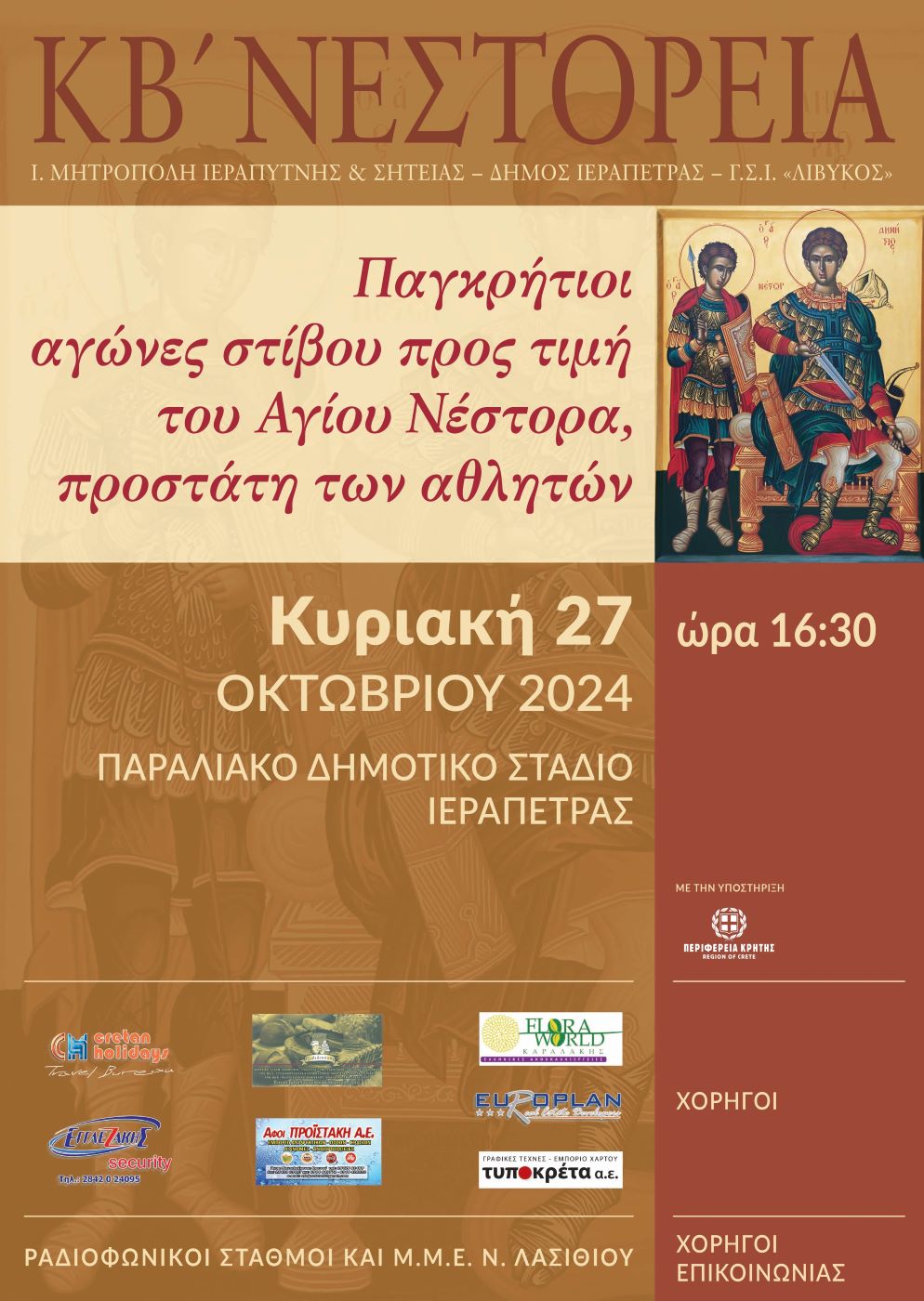 Η Ιερά Μητρόπολη Ιεραπύτνης και Σητείας σε συνεργασία με τον Δήμο Ιεράπετρας και το Γυμναστικό Σύλλογο «ΛΙΒΥΚΟΣ» διοργανώνουν και φέτος αγώνες στίβου, τα «ΚΒ΄ ΝΕΣΤΟΡΕΙΑ», προς τιμήν του Αγίου Μάρτυρος Νέστορος, προστάτου των αθλητών.