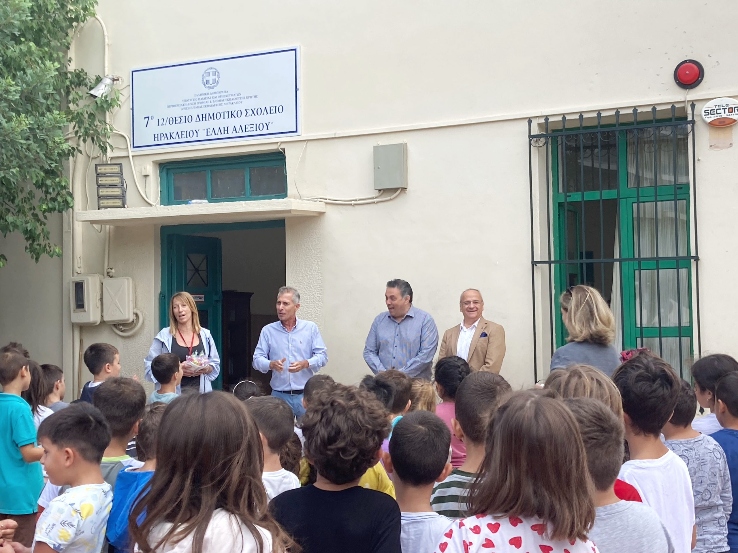 Πρώτος σταθμός το 7ο Δημοτικό Σχολείο Ηρακλείου με την παρουσία του Αντιπεριφερειάρχη Γιώργου Πιτσούλη και του Περιφερειακού Διευθυντή Εκπαίδευσης Μανώλη Καρτσωνάκη.