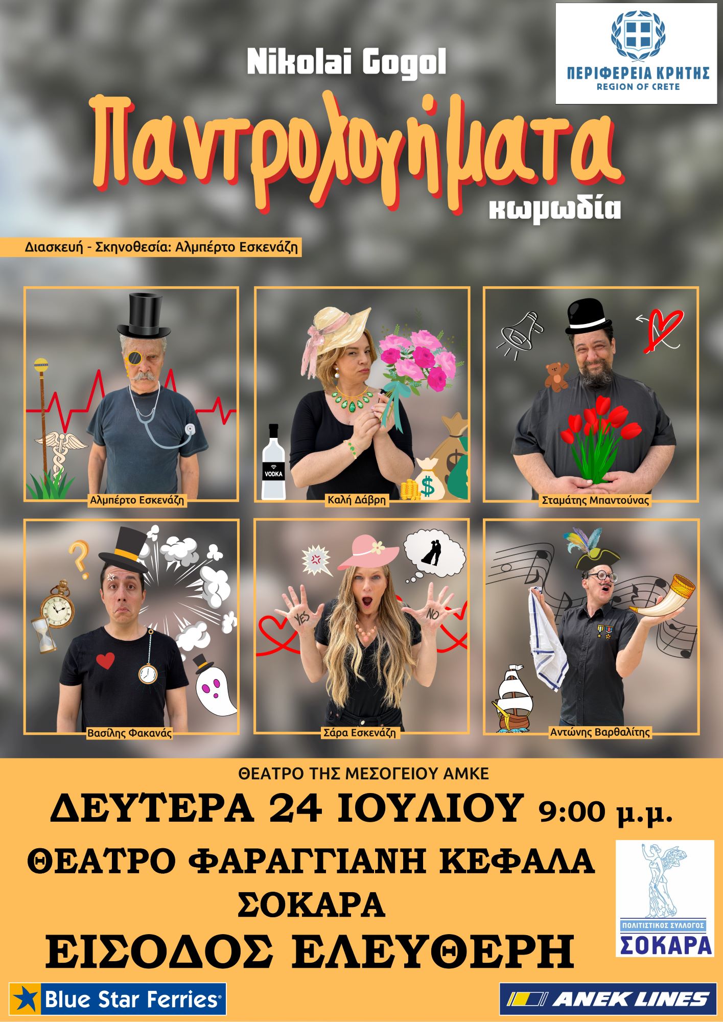 Τη Δευτέρα 24 Ιουλίου 2023 και ώρα 21.00, στο θέατρο Φαραγγιανή Κεφάλα, του Σοκαρά, θα παρουσιαστεί η θεατρική παράσταση του έργου «Παντρολογήματα» του Νικολάϊ Γκόγκολ , από το Θέατρο της Μεσογείου. Μια όαση γέλιου, μία ανατρεπτική κωμωδία πολύ κοντά στη σημερινή εποχή.