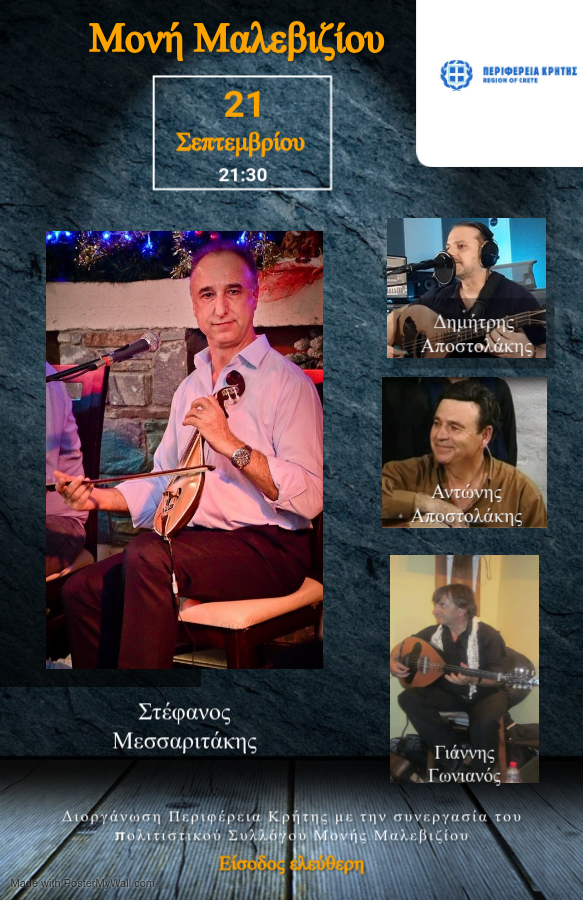 Παραδοσιακή μουσική βραδιά με την στήριξη της Περιφέρειας Κρήτης και ελεύθερη είσοδο για τους πολίτες θα πραγματοποιηθεί το Σάββατο 21 Σεπτεμβρίου στην Μονή Μαλεβιζίου στη πλατεία του χωριού με ώρα έναρξης 21.30 μ.μ.