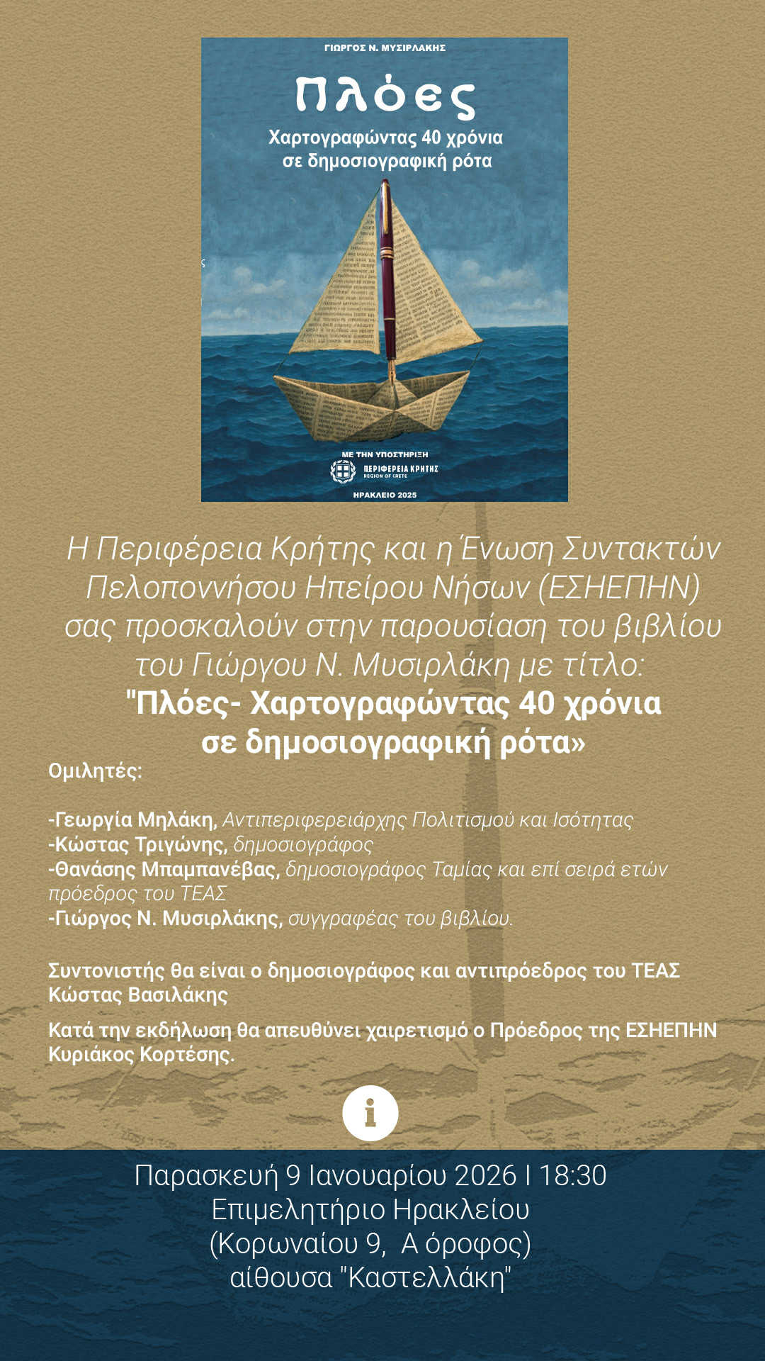 Σαράντα χρόνια δημοσιογραφικής διαδρομής, εμπειριών, αναζητήσεων και καταγραφής της εποχής, συμπυκνώνονται στο βιβλίο του δημοσιογράφου Γιώργου Ν. Μυσιρλάκη με τίτλο «Πλόες – Χαρτογραφώντας 40 χρόνια σε δημοσιογραφική ρότα», το οποίο παρουσιάζουν η Περιφέρεια Κρήτης και η Ένωση Συντακτών Πελοποννήσου, Ηπείρου Νήσων (ΕΣΗΕΠΗΝ).