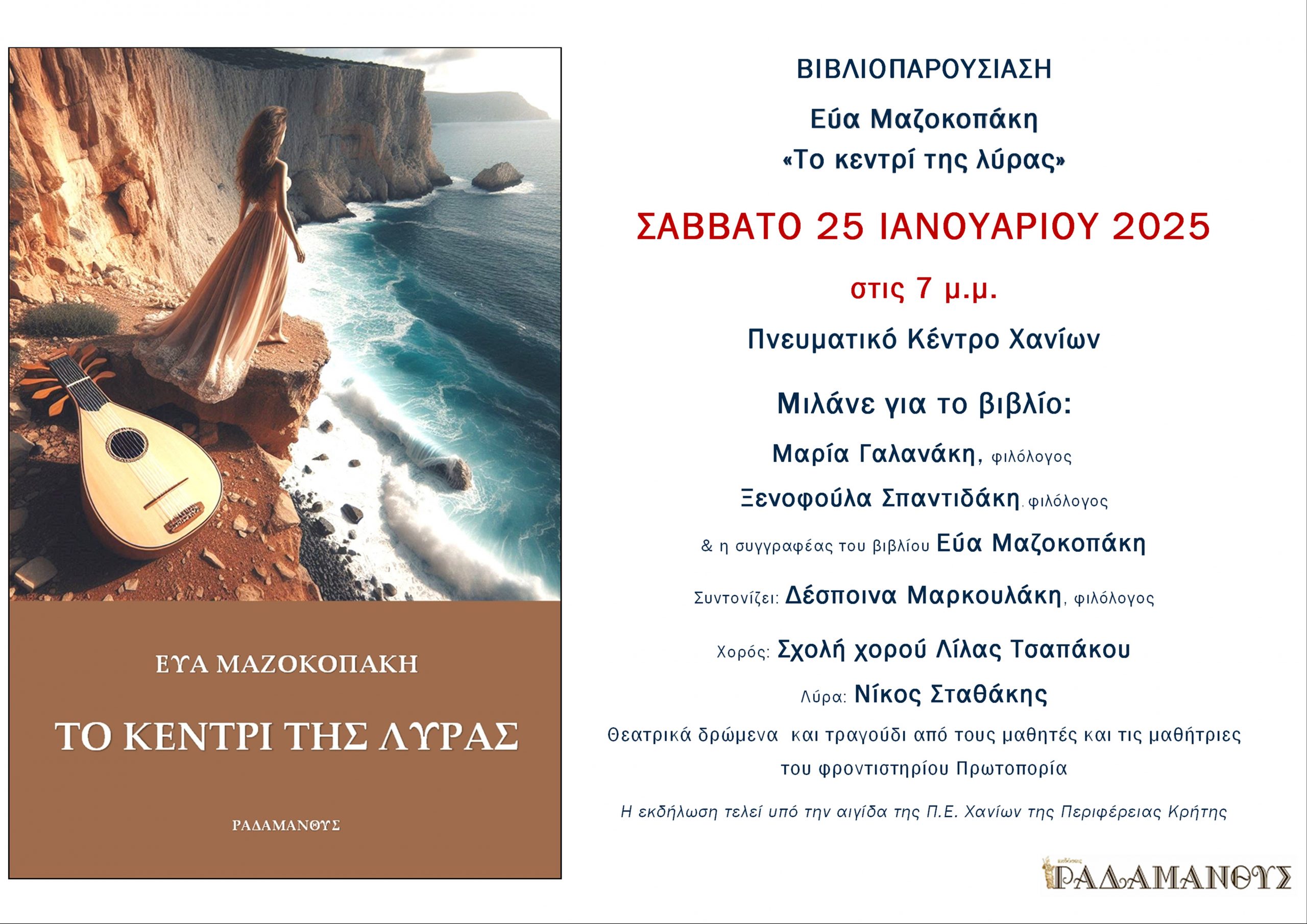 Παρουσίαση του βιβλίου «Το κεντρί της λύρας» της Εύας Μαζοκοπάκη στο Πνευματικό Κέντρο Χανίων